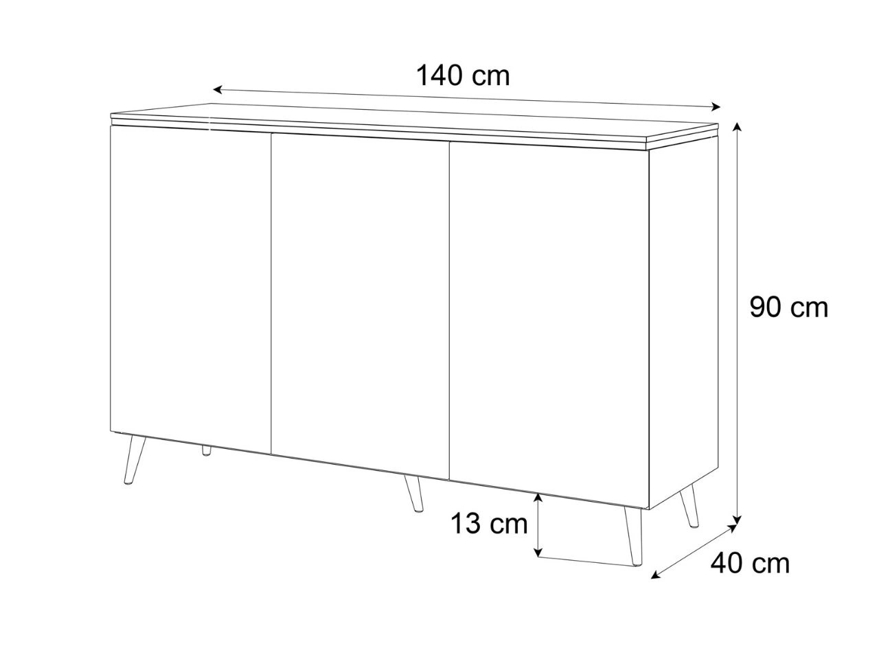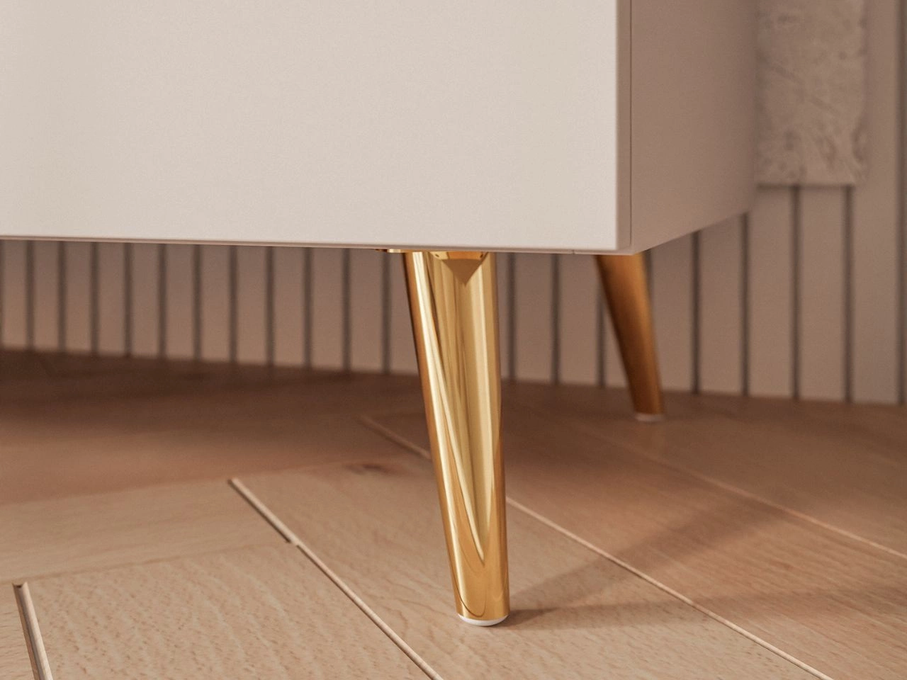 Die Kommode Evare zeichnet sich durch drei Fronttüren aus, die zwei geräumige Staufächer verbergen. Jedes Fach ist zusätzlich mit einem praktischen Einlegeboden unterteilt, was die Funktionalität des Möbels erhöht. Unter der Deckplatte verläuft eine goldene Zierleiste – exakt dieselbe, die auch die Vitrine schmückt. Das Öffnen der Türen erfolgt ebenfalls über das Push-to-Open-System.