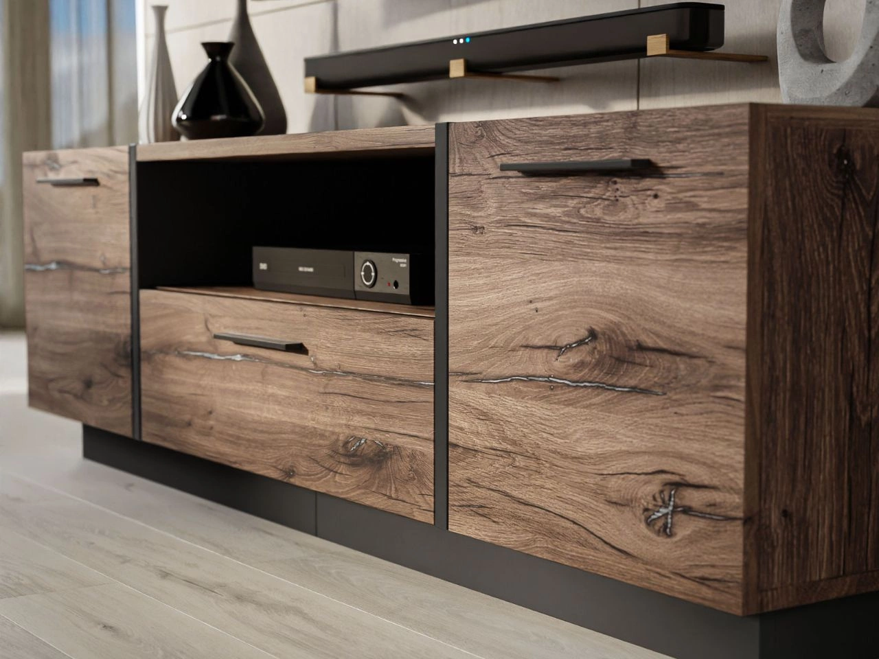 TV-Lowboard Lunelie wurde für moderne Wohnzimmer entworfen. Es verfügt über zwei Seitenschränke, eine Schublade sowie ein offenes Fach für Multimedia-Geräte und bietet viel Platz für Zubehör und Technik. Dieses Möbelstück vereint stilvolles Design mit hoher Funktionalität.