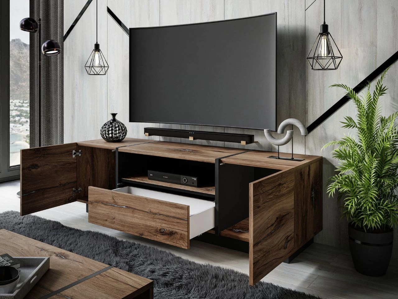 TV-Lowboard Lunelie wurde speziell für das moderne Wohnzimmer entworfen. Es verfügt über zwei Seitenschränke, eine Schublade sowie ein offenes Fach für Multimedia-Geräte und bietet reichlich Platz für Zubehör und Elektronik. Dieses Möbelstück verbindet stilvolles Design mit hoher Alltagstauglichkeit.