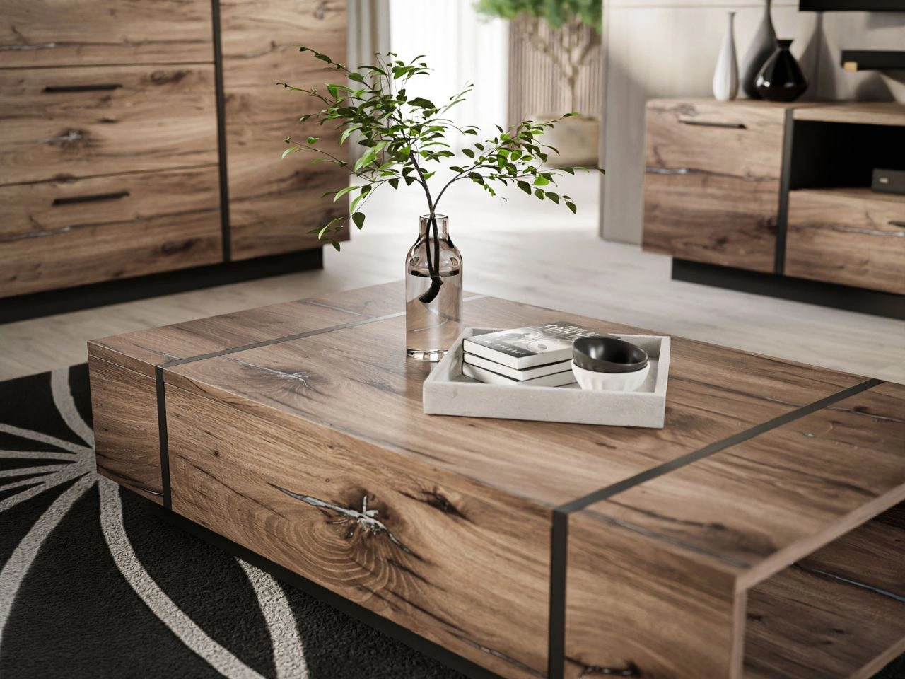 Wohnzimmer ist der Raum, in dem sich das häusliche Leben konzentriert – hier entspannen wir mit der Familie, empfangen Gäste und arbeiten oft auch. Daher ist es wichtig, dass die Einrichtung dieses Bereichs Ästhetik und Funktionalität miteinander verbindet. Dabei hilft das Möbelset Lunelie, bestehend aus einer Kommode, einem TV-Lowboard und einem Couchtisch, die mit viel Liebe zum Detail gefertigt wurden.