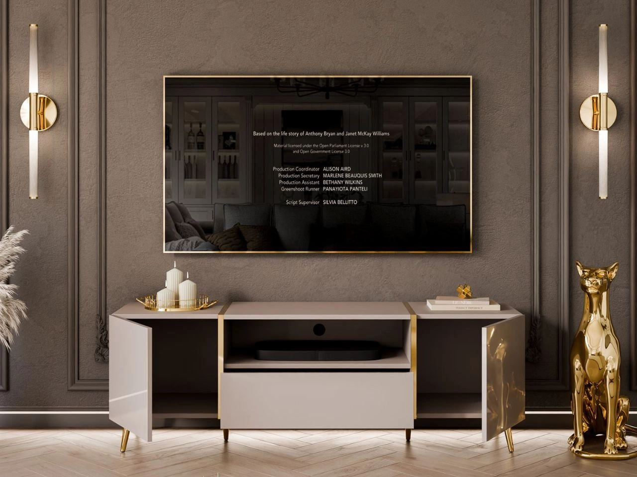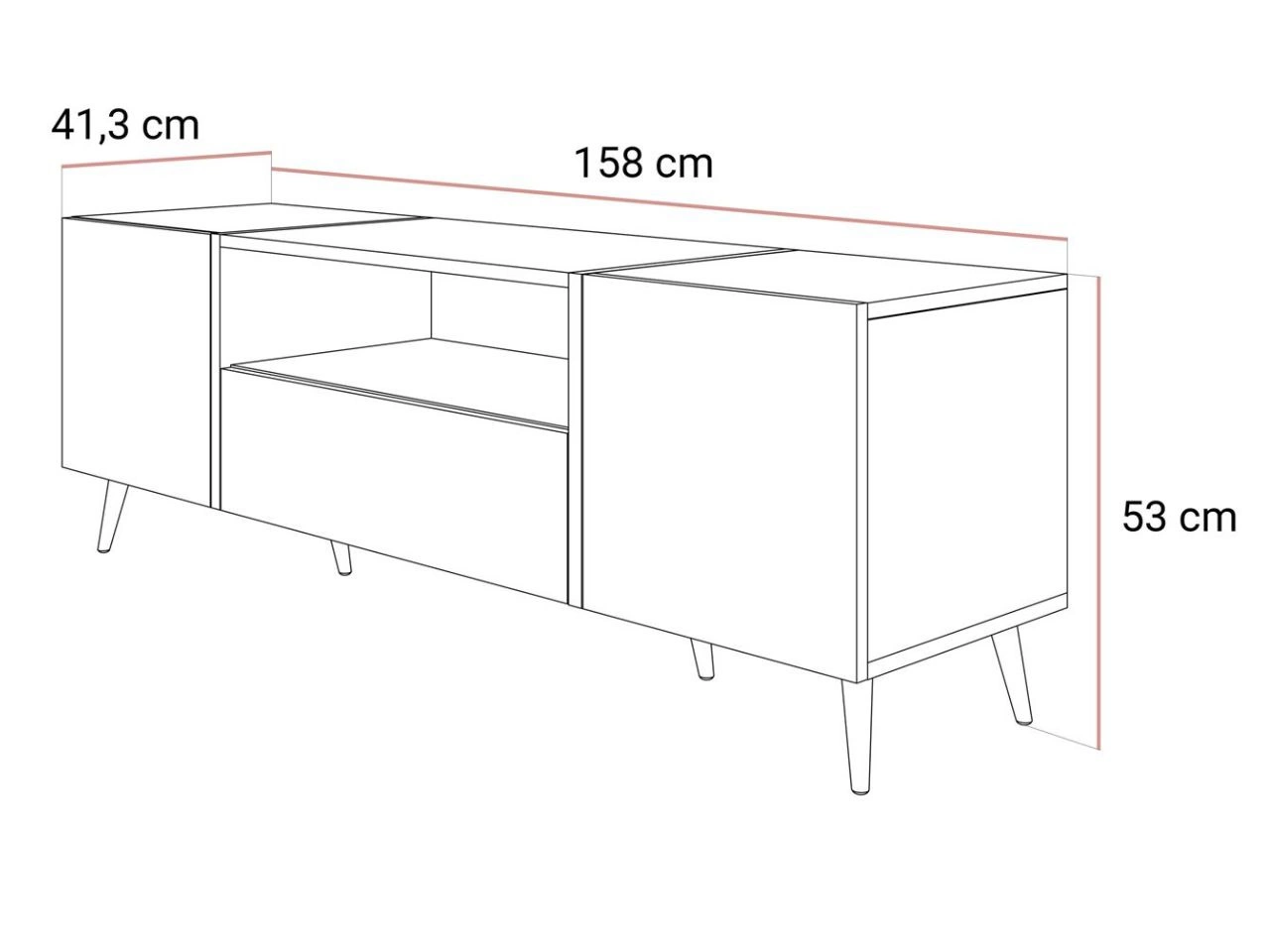 TV-Lowboard Lunelie wurde im Sinne moderner Funktionalität gestaltet. Zwei Seitenschränke, eine praktische Schublade und ein offenes Fach für Multimedia-Geräte ermöglichen eine aufgeräumte Organisation. Dieses Modell vereint elegantes Design mit durchdachten Lösungen, die den Alltag im Wohnzimmer erleichtern.