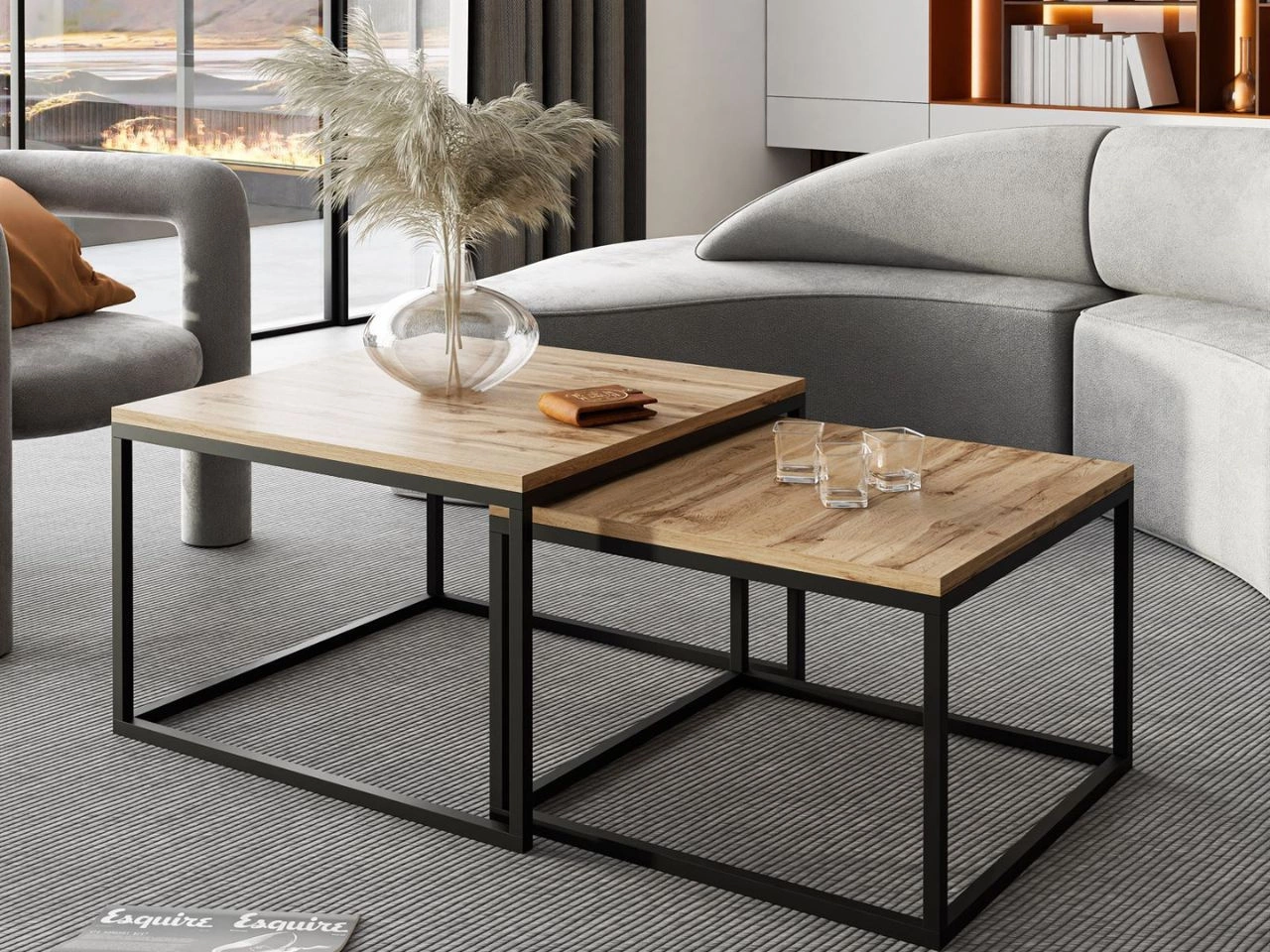 Tischplatten aus laminiertem Holzwerkstoff in Holzoptik begeistern durch ihre realistische Maserung und verleihen dem Raum eine gemütliche Atmosphäre. Die Kombination aus warmen Holztönen und einem schwarzen Stahlgestell sorgt für einen ausdrucksstarken Kontrast, der dem Set ein modernes, stilvolles Erscheinungsbild verleiht. Das Ensemble wirkt leicht und elegant und ist nicht nur ein praktisches Möbelstück, sondern auch ein dekoratives Highlight im Wohnzimmer.