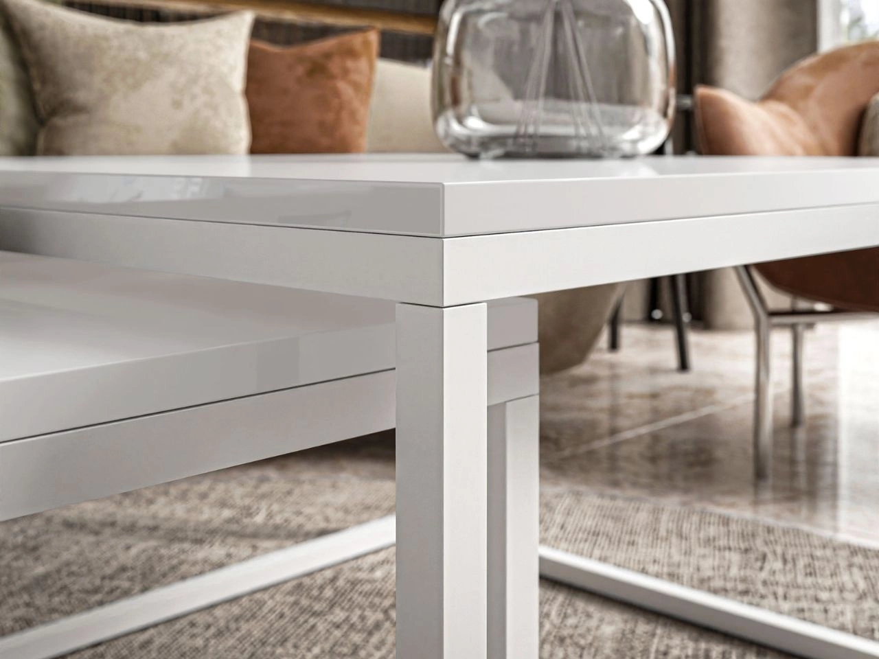 Hochglanz-Tischplatten aus hochwertiger, laminierter Möbelplatte begeistern durch ihre glatte, glänzende Oberfläche, die das Licht wunderschön reflektiert und den Raum optisch aufhellt. In Kombination mit dem weißen Stahlgestell entsteht ein modernes, leichtes und stilvolles Set, das perfekt den Charakter zeitgenössischer Einrichtungen unterstreicht.