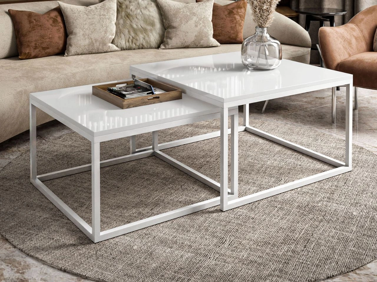 Unterschiedlichen Tischgrößen ermöglichen es, den kleineren Tisch einfach unter den größeren zu schieben, wodurch das Set nicht nur elegant, sondern auch äußerst praktisch ist. Diese Lösung eignet sich ideal für großzügige Wohnräume ebenso wie für kompaktere Zimmer, in denen Funktionalität, Ästhetik und Liebe zum Detail gefragt sind.