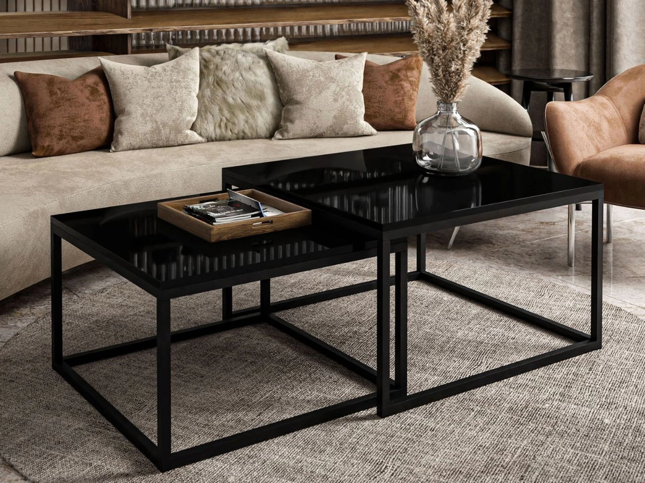 Unterschiedlichen Tischgrößen ermöglichen es, den kleineren Tisch einfach unter den größeren zu schieben, wodurch das Set nicht nur elegant, sondern auch äußerst praktisch ist. Diese Lösung eignet sich ideal für großzügige Wohnräume ebenso wie für kompaktere Zimmer, in denen Funktionalität, Ästhetik und Liebe zum Detail gefragt sind.