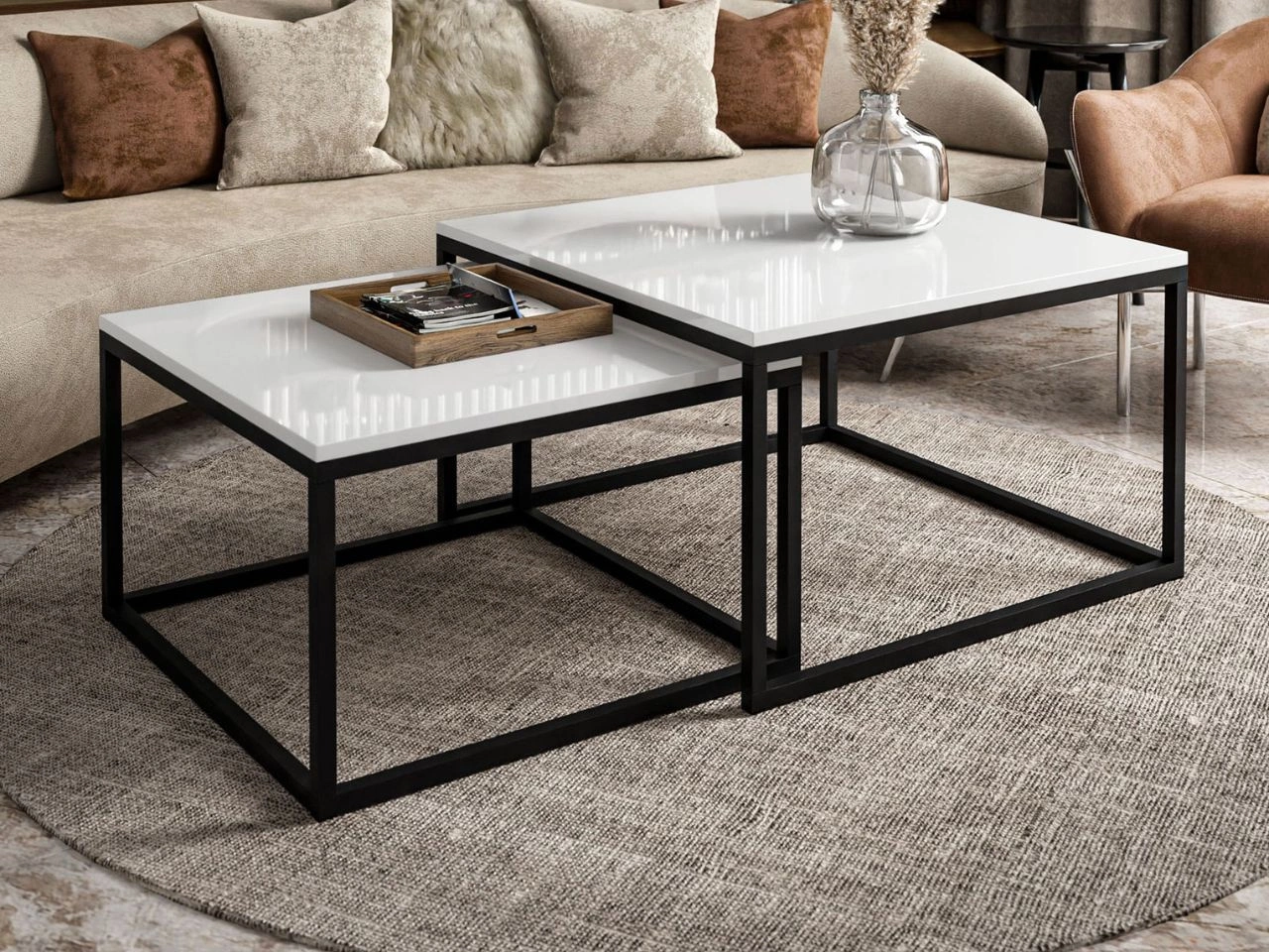 Unterschiedlichen Tischgrößen ermöglichen es, den kleineren Tisch einfach unter den größeren zu schieben, wodurch das Set nicht nur elegant, sondern auch äußerst praktisch ist. Diese Lösung eignet sich ideal für großzügige Wohnräume ebenso wie für kompaktere Zimmer, in denen Funktionalität, Ästhetik und Liebe zum Detail gefragt sind.