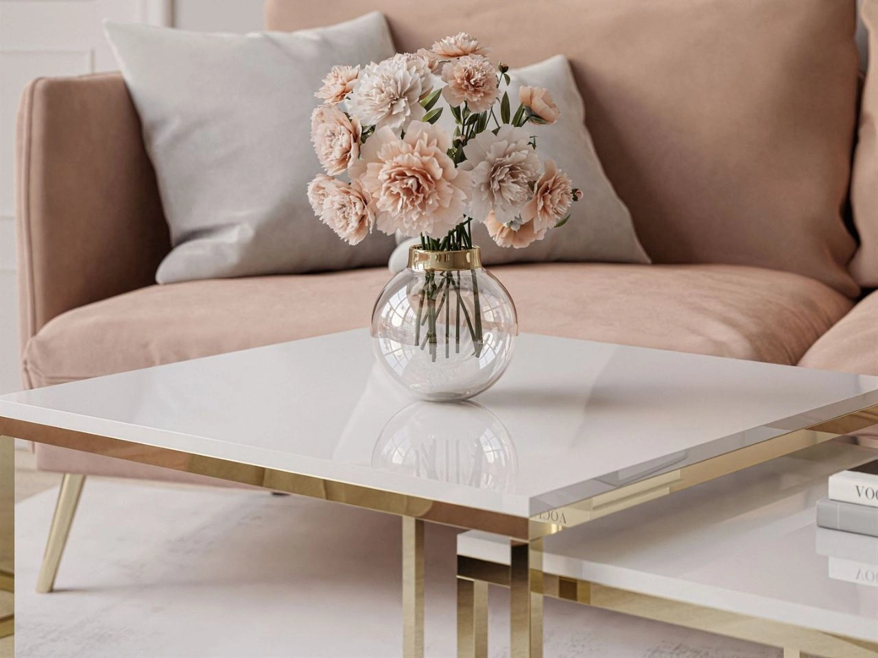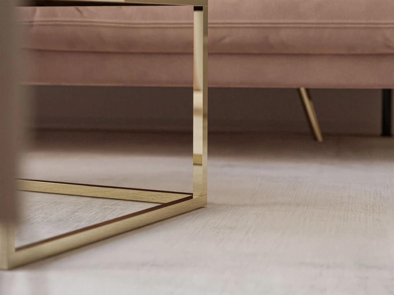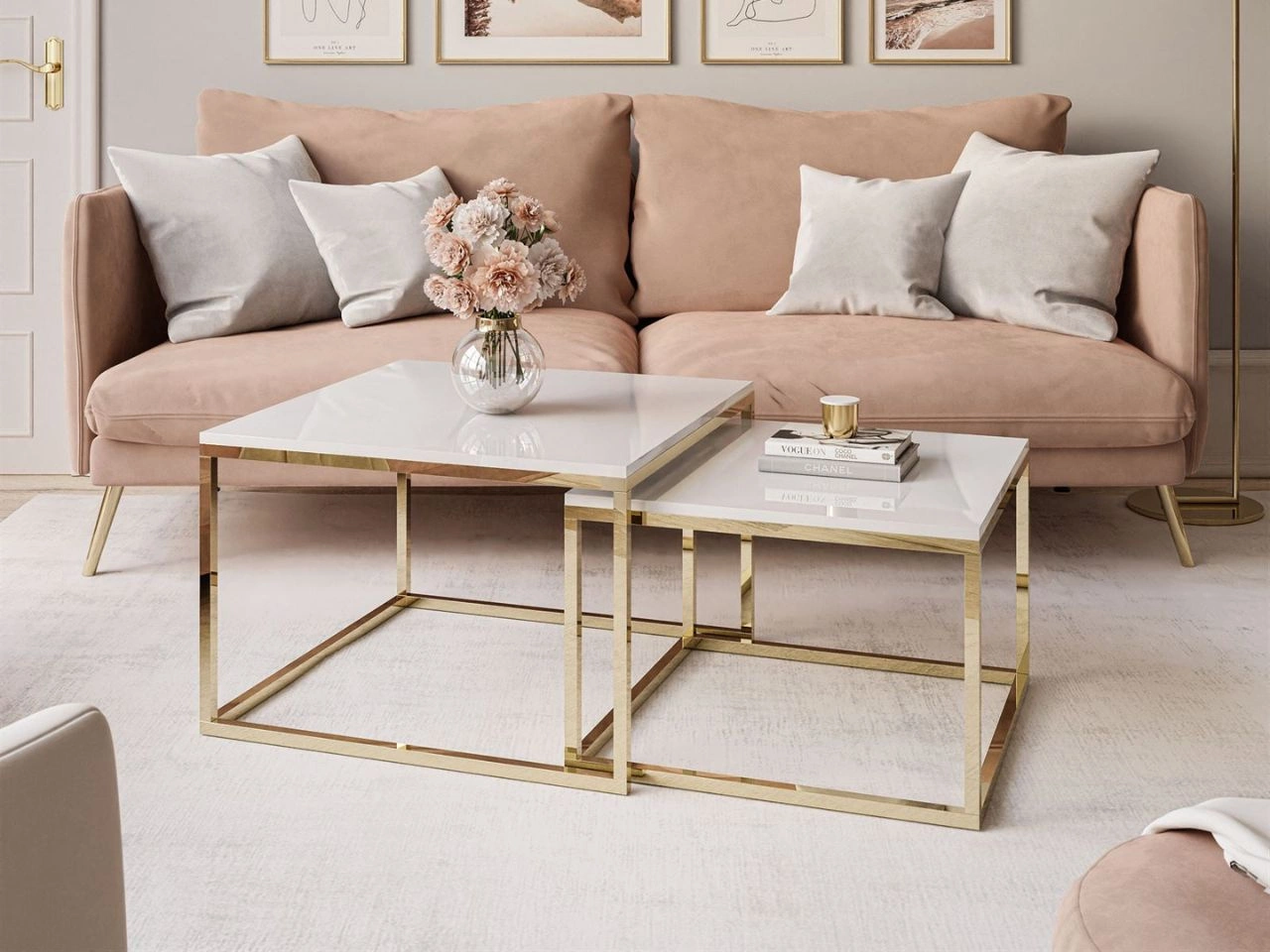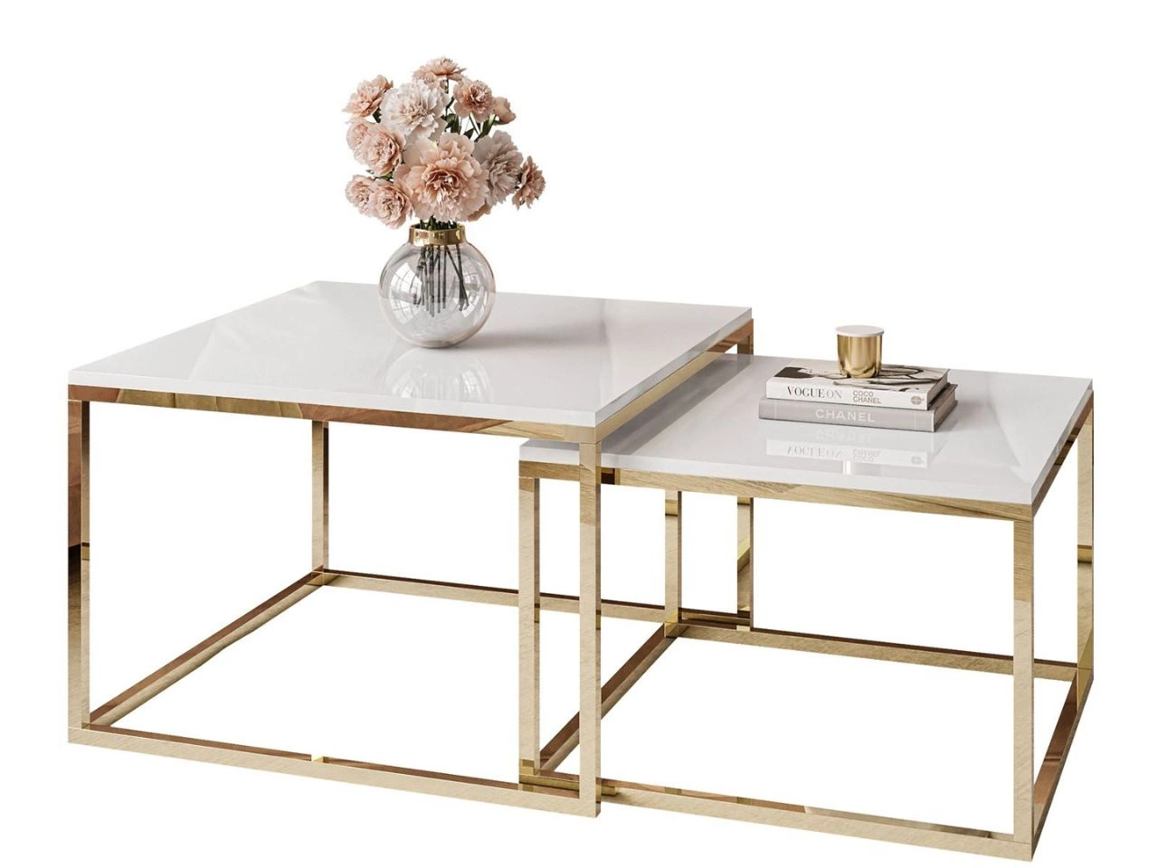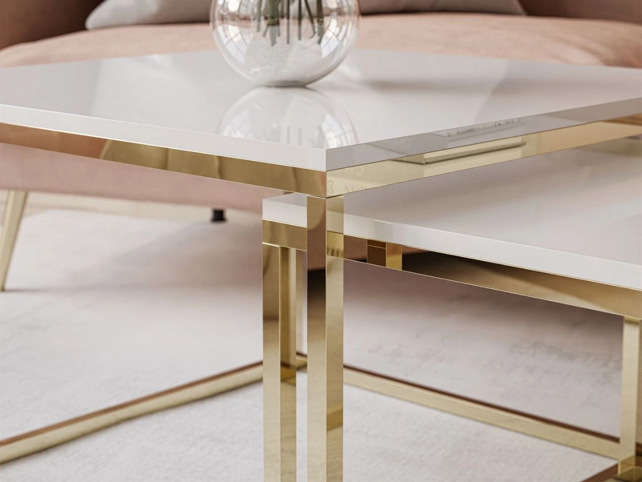 Glänzend weiße Acryl-Arbeitsplatten reflektieren das Licht zart und verleihen dem Innenraum eine helle, luftige Atmosphäre. Der goldfarbene Metallrahmen setzt elegante Akzente und bringt einen Hauch von Luxus in jedes Interieur. Dank der cleveren Größenkombination lässt sich der kleinere Tisch mühelos unter den größeren schieben – perfekt, wenn Sie Platz sparen möchten.