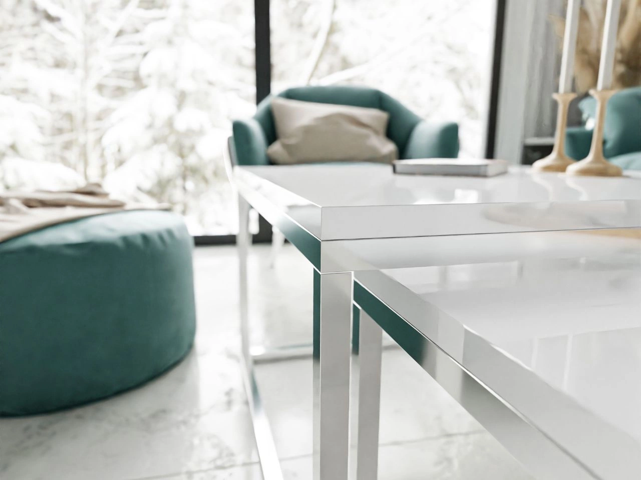 Hochglanz-Tischplatten aus hochwertiger laminierter Möbelplatte begeistern mit einer glatten, glänzenden Oberfläche, die das Licht reflektiert und den Raum optisch aufhellt. In Kombination mit dem verchromten Stahlgestell entsteht ein modernes, leichtes und elegantes Ensemble, das jedes zeitgemäße Interieur perfekt ergänzt.