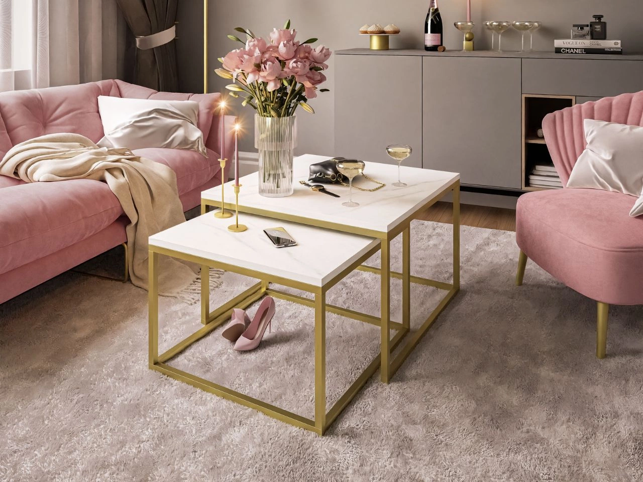 Die Tischplatten der Couchtische bestehen aus 16 mm starker Laminatplatte in einer eleganten Weiß-Marmor-Optik, die dem Raum einen luxuriösen und modernen Charakter verleiht. Das Gestell aus mattem, goldfarbenem Stahl, pulverbeschichtet, unterstreicht das edle Erscheinungsbild des Möbels und sorgt für Stabilität. Das Gesamtbild ergibt eine harmonische Komposition aus Eleganz und Funktionalität – perfekt für moderne und glamouröse Wohnräume.