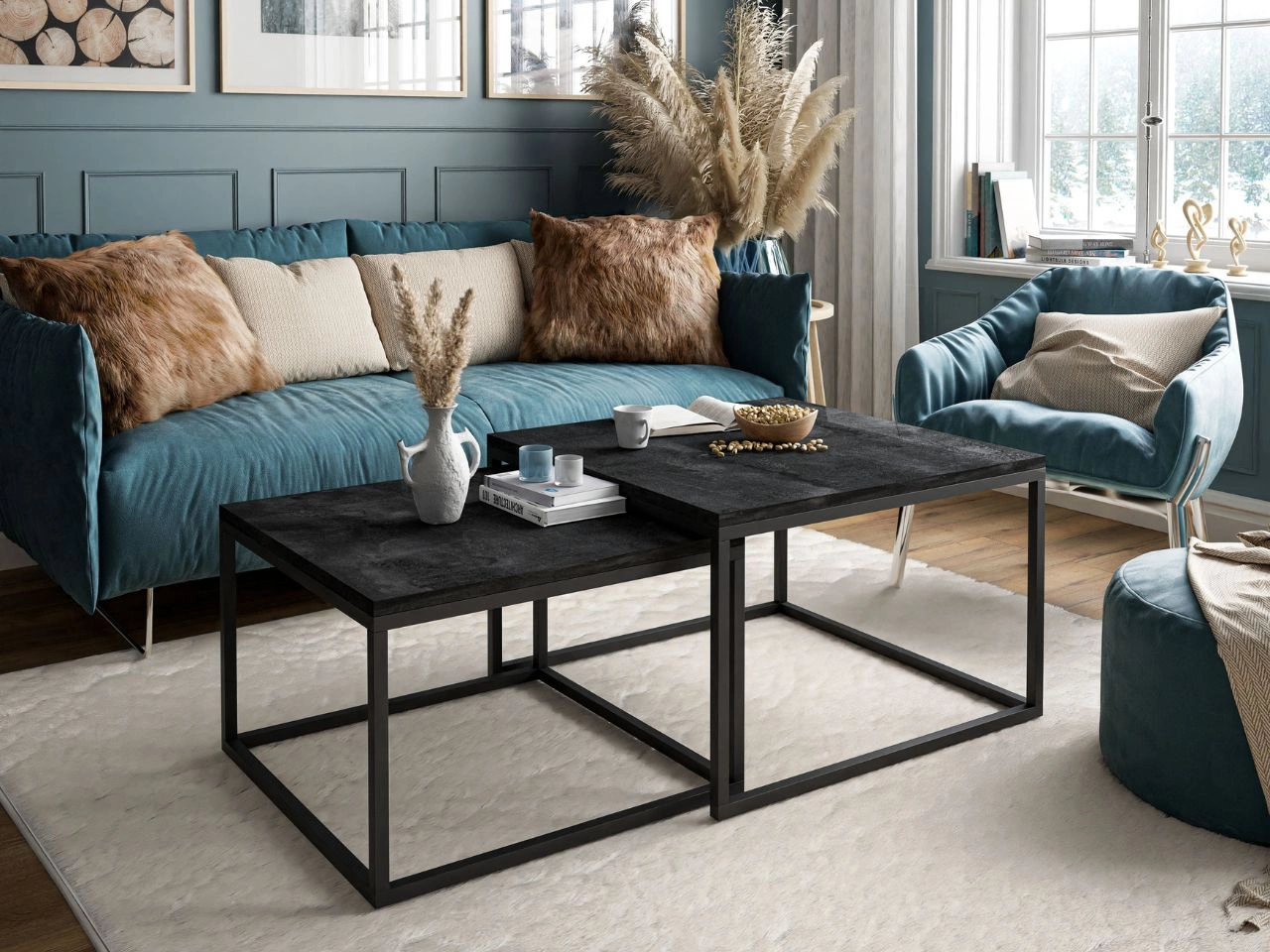Die Tischplatte aus laminierter Platte in dunkler Betonoptik verleiht dem Tisch einen eleganten und luxuriösen Charakter. Das matte, schwarz pulverbeschichtete Stahlgestell bringt einen modernen und zugleich loftartigen Akzent ins Spiel und betont die Stabilität sowie den designerhaften Stil des Möbels. Dieses Modell wird besonders Liebhabern industrieller Einrichtung und moderner Eleganz gefallen.