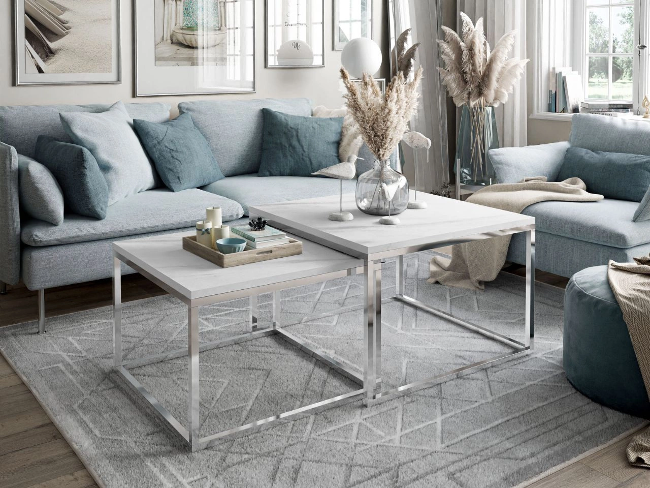 Die Tischplatte aus laminierter Holzplatte im Dekor weißen Marmors verleiht dem Couchtisch Eleganz und dezenten Luxus, wobei sie die Struktur von natürlichem Stein authentisch nachbildet. Ihre glatte Oberfläche überzeugt nicht nur durch ihre Ästhetik, sondern auch durch die einfache Pflege. Das stabile, verchromte Gestell begeistert mit einem spiegelnden Glanz, der perfekt mit der hellen Tischplatte harmoniert. Die Kombination dieser Materialien bildet ein harmonisches Duo – modern, langlebig und ausgesprochen stilvoll, ideal für elegante Wohnräume mit zeitgemäßem Charakter.
