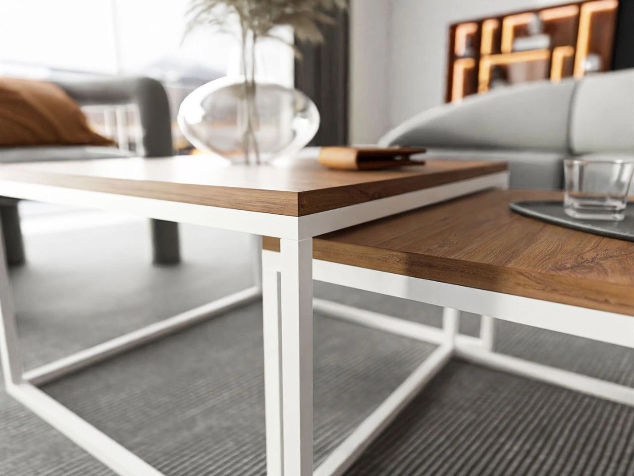 Suchen Sie nach einer Möglichkeit, Ihr Wohnzimmer elegant und gleichzeitig funktional zu gestalten? Couchtisch-Set Asumi 2in1 ist die perfekte Wahl für alle, die klare Formen und den industriellen Stil schätzen. Zwei Tische in unterschiedlicher Höhe bilden ein harmonisches Duo, das je nach Bedarf und verfügbarem Platz zusammen oder separat aufgestellt werden kann.