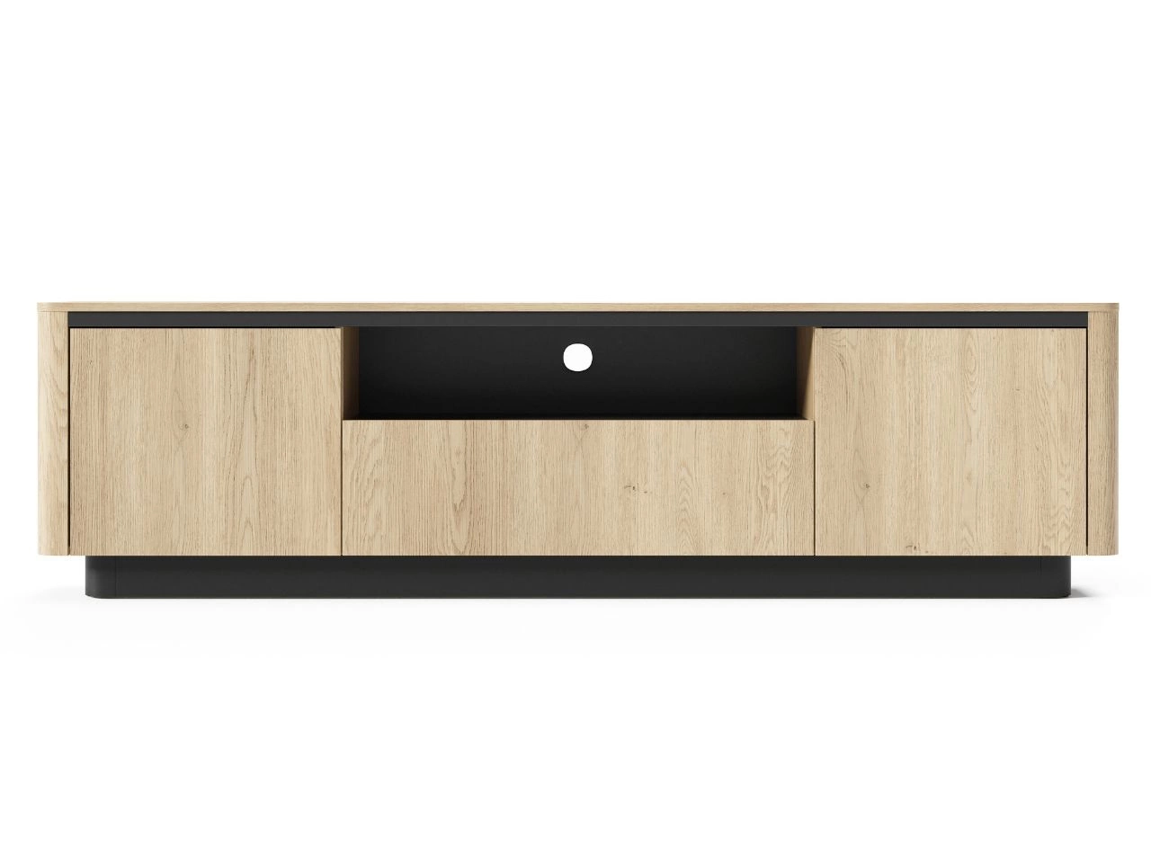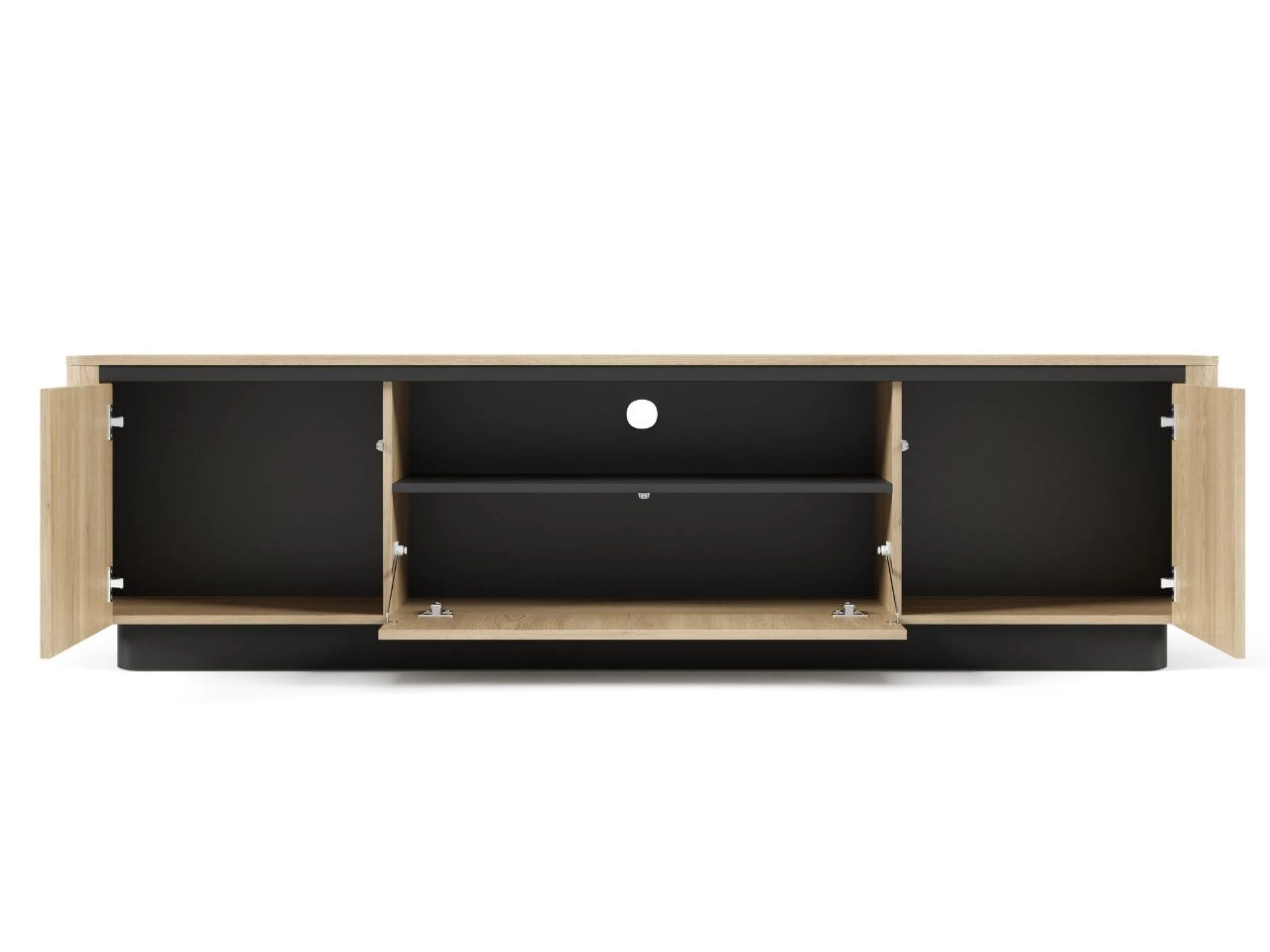 Die Fernsehkommode Fascino besticht durch ihre elegante Farbkombination aus Eiche Cremona und mattschwarzen Akzenten, die unter der Deckplatte und am Sockel verlaufen. Das Möbel verfügt über drei Schrankfächer sowie ein offenes Multimediafach. Die Öffnung an der Rückwand ermöglicht eine saubere Kabelführung und sorgt für Ordnung. Die beiden äußeren Türen öffnen sich klassisch, während die mittlere Klappe nach unten aufklappt und mit Gasdruckdämpfern ausgestattet ist – für sanftes und kontrolliertes Öffnen.