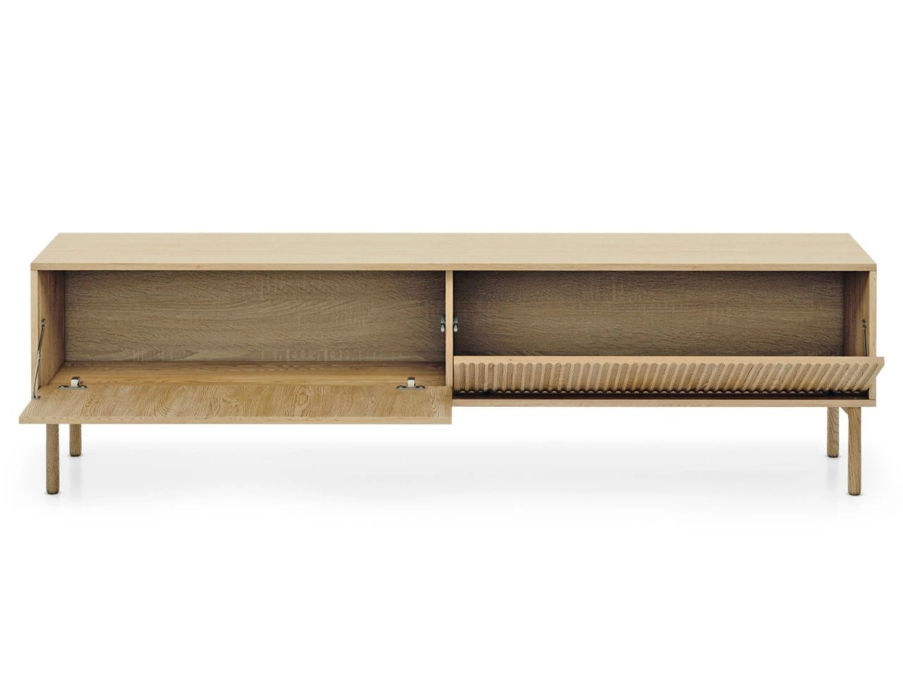Im Inneren bietet das Lowboard großzügigen Stauraum – auf der einen Seite befindet sich eine nach unten öffnende Klappe, auf der anderen ein Fach mit der charakteristisch geriffelten Front. Beide Bereiche bieten viel Platz für TV-Geräte, Zubehör oder andere Alltagsgegenstände. Die Rückwand ist aus HDF in Sonoma-Eiche-Optik gefertigt und sorgt für ein ästhetisches, stimmiges Gesamtbild auch im Innenraum. Getragen wird die Konstruktion von massiven Holzfüßen, die dem Möbelstück Leichtigkeit verleihen und seinen modernen Charakter unterstreichen.