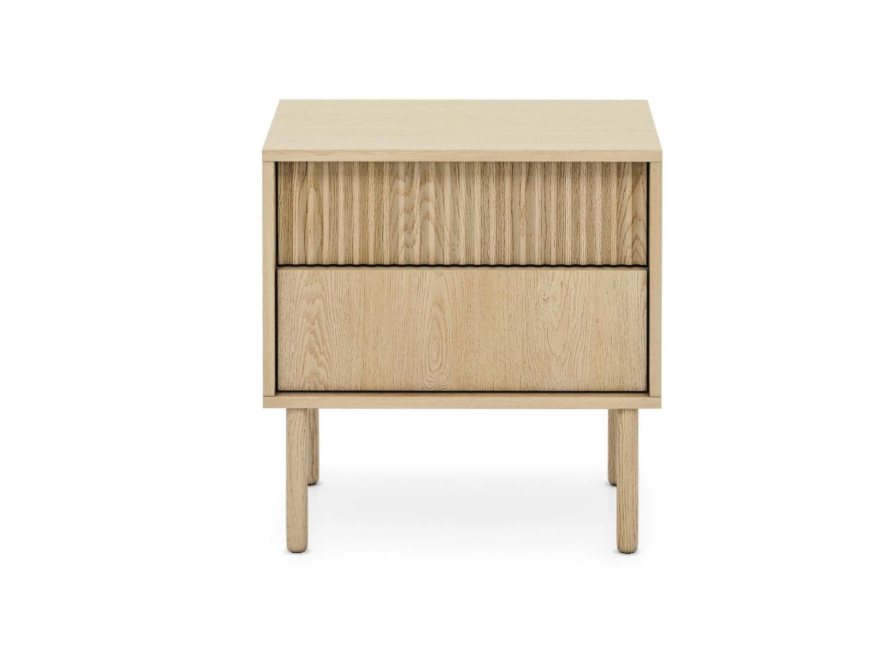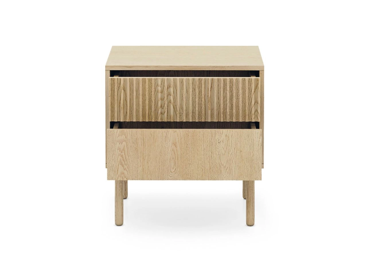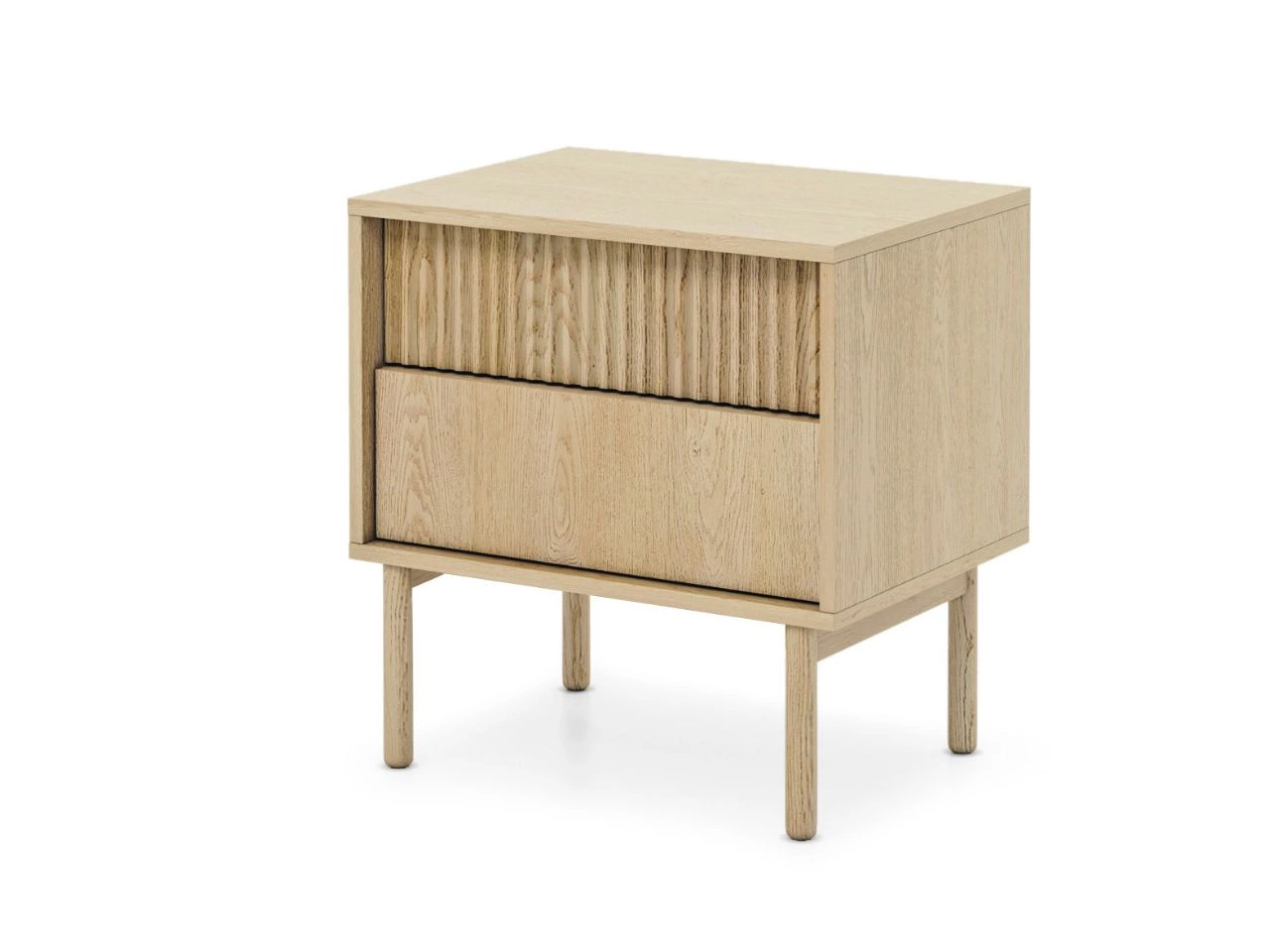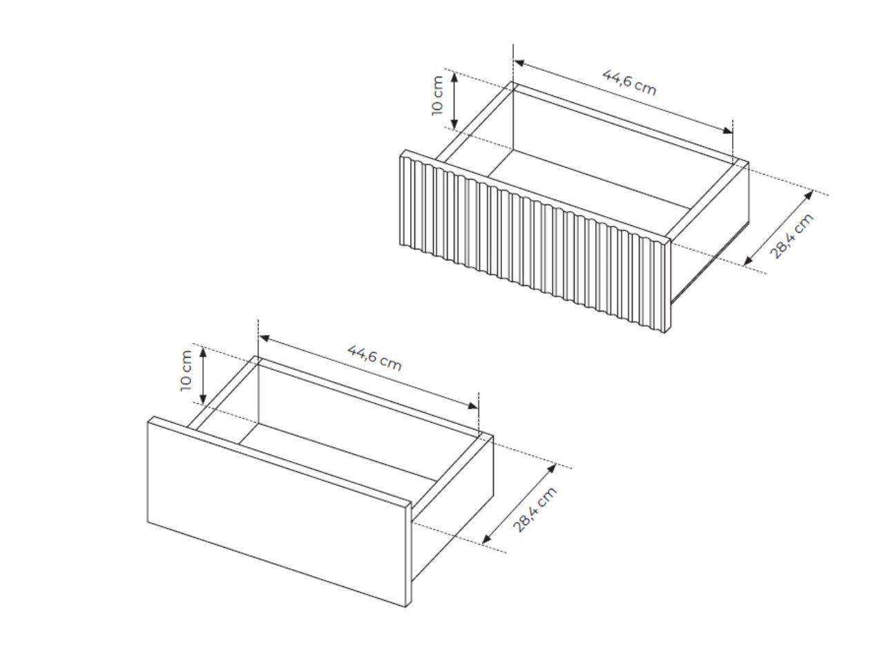 Die Fronten des Nachttisches bestehen aus einer Kombination aus geriffelter MDF-Platte und laminierter Spanplatte, wodurch sie eine dekorative, dreidimensionale Struktur erhalten, die den einzigartigen Stil der Kollektion unterstreicht. Der Korpus aus laminierter Spanplatte wurde mit einer farblich abgestimmten ABS-Kante versehen, die ihn widerstandsfähiger gegen alltägliche Nutzung macht und die Lebensdauer des Möbelstücks verlängert. Die Schubladen öffnen sich durch das Push-to-Open-System, das eine klare, grifflose und minimalistische Optik ermöglicht.