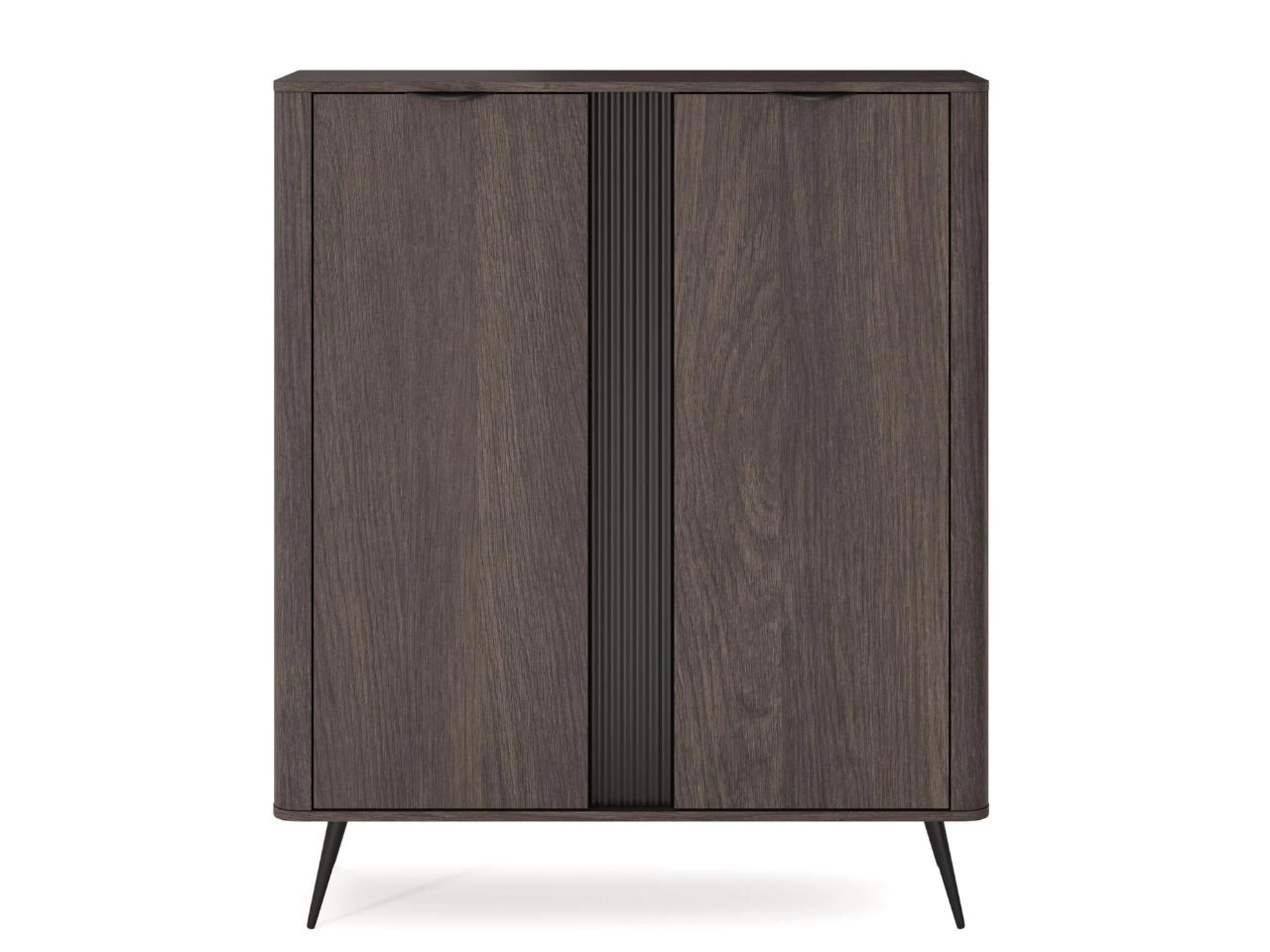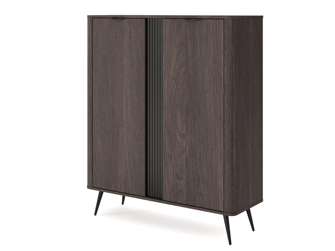 Front und Korpus bestehen aus einer laminierten Spanplatte, die mit einer langlebigen ABS-Kante geschützt ist und so die Widerstandsfähigkeit im Alltag erhöht. Ein charakteristisches Element der Kollektion ist die geriffelte MDF-Einlage sowie die abgerundeten MDF-Leisten an den Seiten, die dem Möbelstück einen einzigartigen, modernen Designcharakter verleihen.