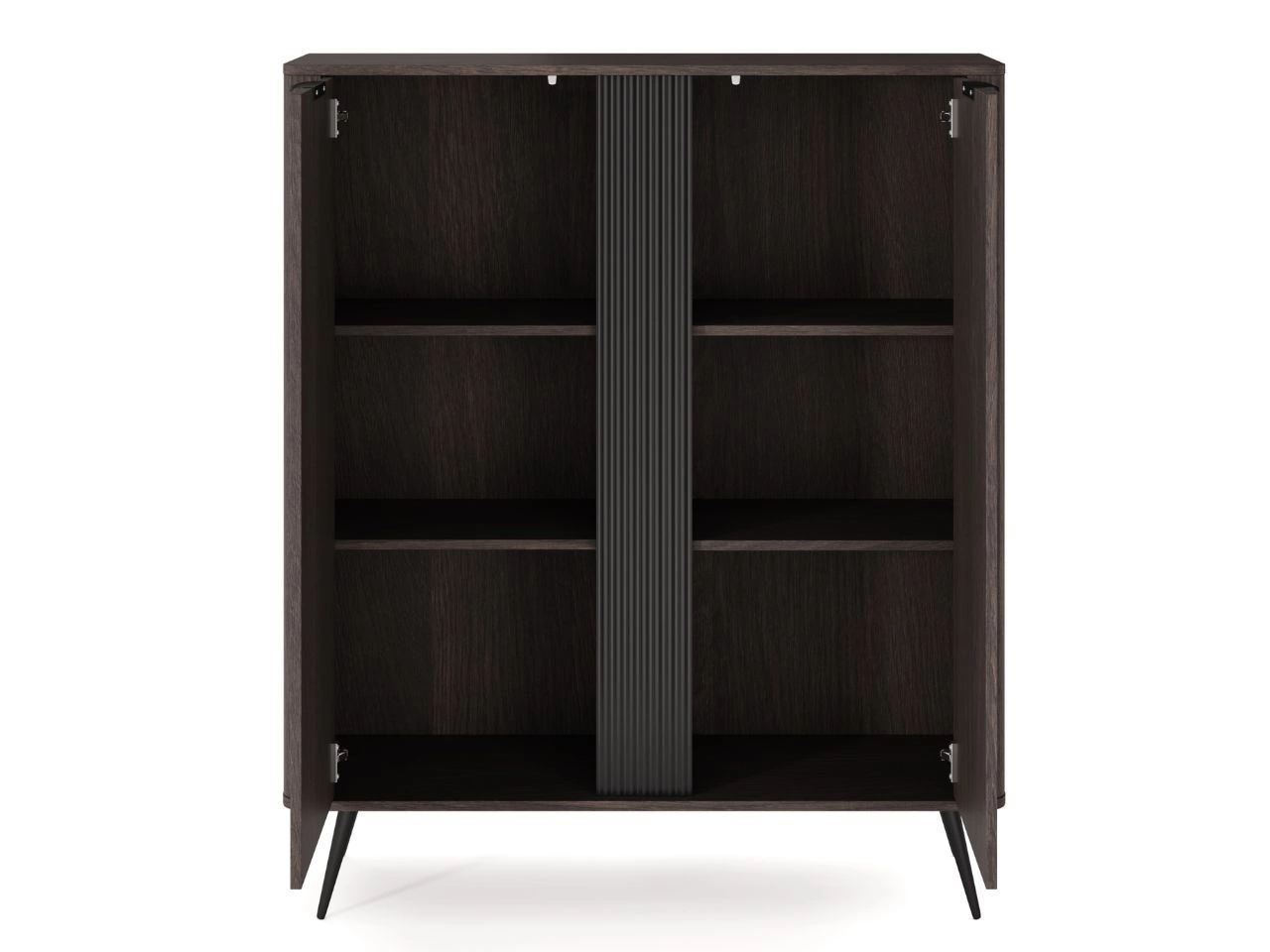 Das Innere der Kommode wurde mit Blick auf Funktionalität und praktische Organisation gestaltet. Hinter den Fronten befinden sich funktionale Einlegeböden, die viel Stauraum für verschiedenste Wohnaccessoires bieten. Die Rückwand besteht aus einer HDF-Platte, farblich abgestimmt auf Eiche Dunin, was eine ästhetische und harmonische Optik von allen Seiten gewährleistet.