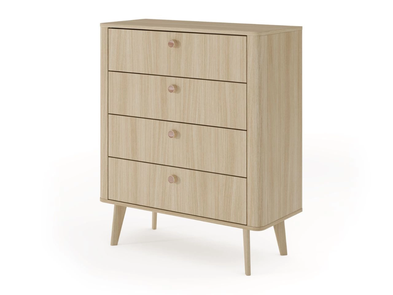 Kommode Bilancio zeichnet sich durch eine leichte, elegante Form aus, die perfekt zu modernen, skandinavischen und gemütlichen Einrichtungskonzepten passt. Der warme Farbton Eiche Barista verleiht dem Möbelstück eine natürliche Ausstrahlung, während die abgerundeten Seiten mit MDF-Leiste seinen zeitlosen Charakter betonen.