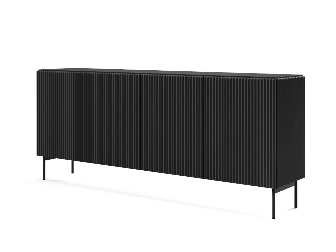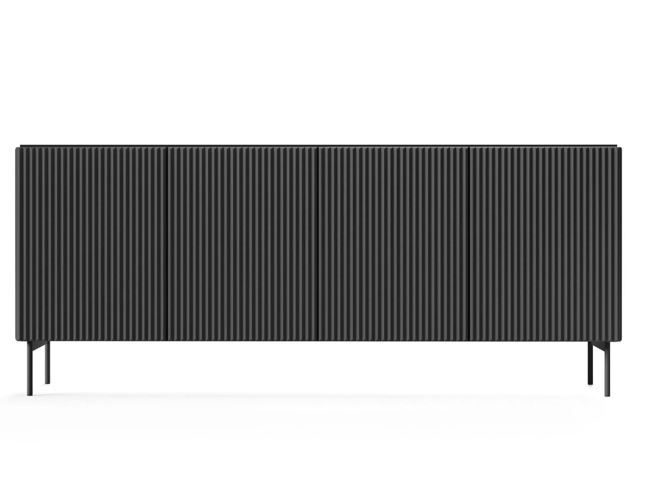 Die Fronten wurden in derselben geriffelten Struktur wie der Korpus ausgeführt, wodurch ein einheitliches und modernes Gesamtbild entsteht. Die Kommode ist mit vier geschlossenen Schrankfächern ausgestattet, die praktischen und gut organisierten Stauraum bieten. Die Rückwand wurde mit einer HDF-Platte verstärkt, was die Konstruktion zusätzlich stabilisiert und ein sauberes, harmonisches Finish im Inneren des Möbelstücks gewährleistet.