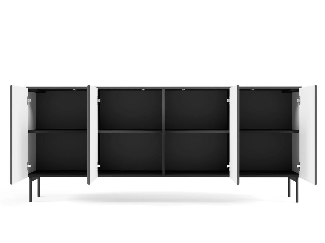Das Push-to-Open-System macht Griffe überflüssig – ein sanfter Druck genügt, um die Türen zu öffnen. Diese Lösung betont den minimalistischen Charakter der Kommode und erhöht gleichzeitig den Bedienkomfort. Die gesamte Konstruktion steht auf schlanken Metallbeinen, die Leichtigkeit verleihen und einen dezenten, industriellen Akzent setzen.