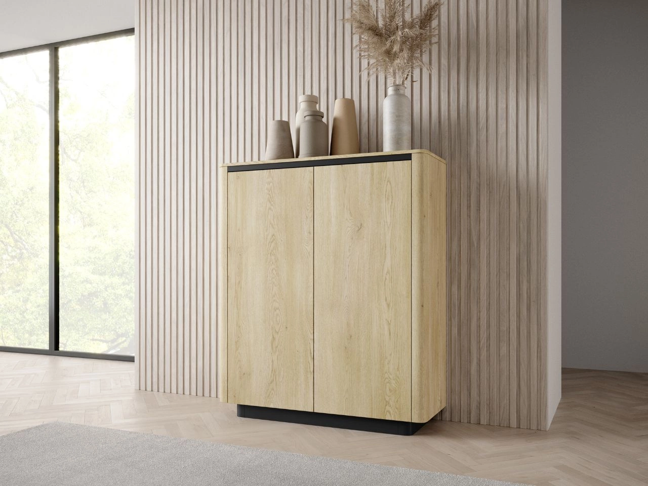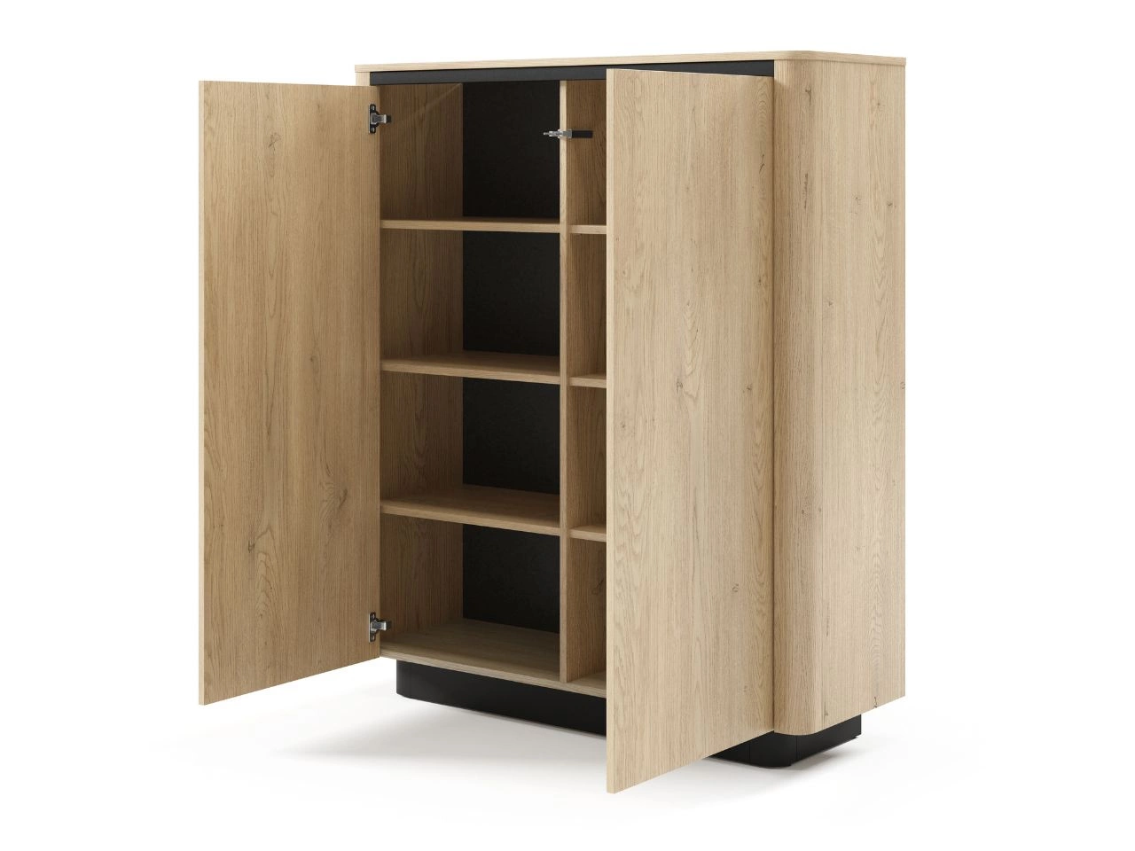 Die hohe Kommode verbirgt hinter zwei Türen einen großzügigen Stauraum, der durch Einlegeböden in mehrere Bereiche unterteilt ist. Das TV-Lowboard verfügt über eine mittlere Klapptür, die nach unten aufgeht; zur Vermeidung eines freien Herabfallens sind praktische Dämpfer integriert. Über der Klapptür befindet sich ein offenes Fach für Multimedia-Geräte. In der Rückwand ist eine runde Öffnung eingelassen, durch die Kabel ordentlich nach außen geführt werden können.