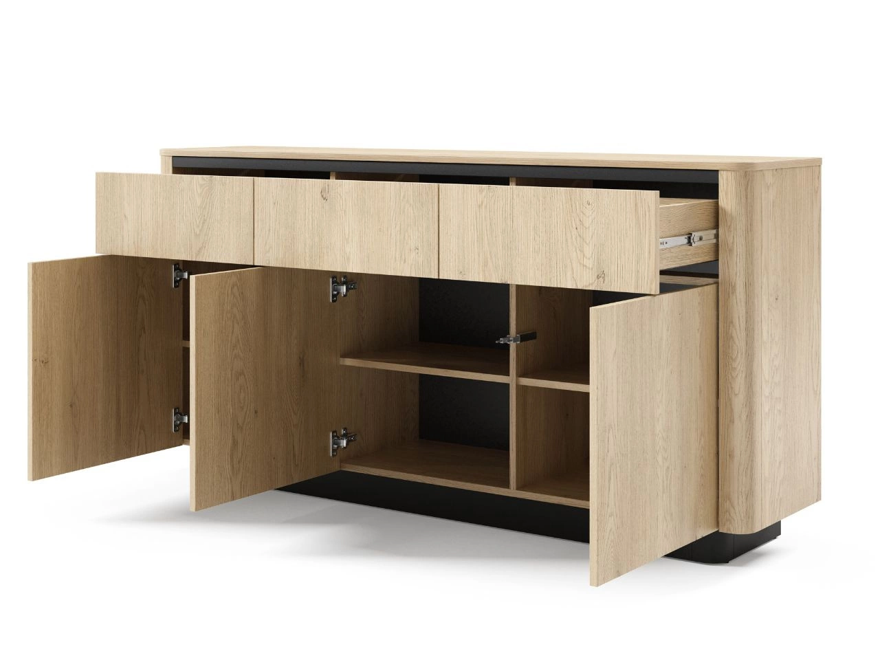 Wohnzimmermöbel-Set Fascino vereint modernes Design, hohe Funktionalität und eine elegante Ausführung. Das Set besteht aus einer hohen, zweitürigen Kommode, einem TV-Lowboard sowie einer breiten, dreitürigen Kommode. Alle Elemente sind im Dekor Eiche Cremona mit schwarzen, matten Akzenten gestaltet, die dem Ensemble einen dezent industriellen Charakter verleihen.