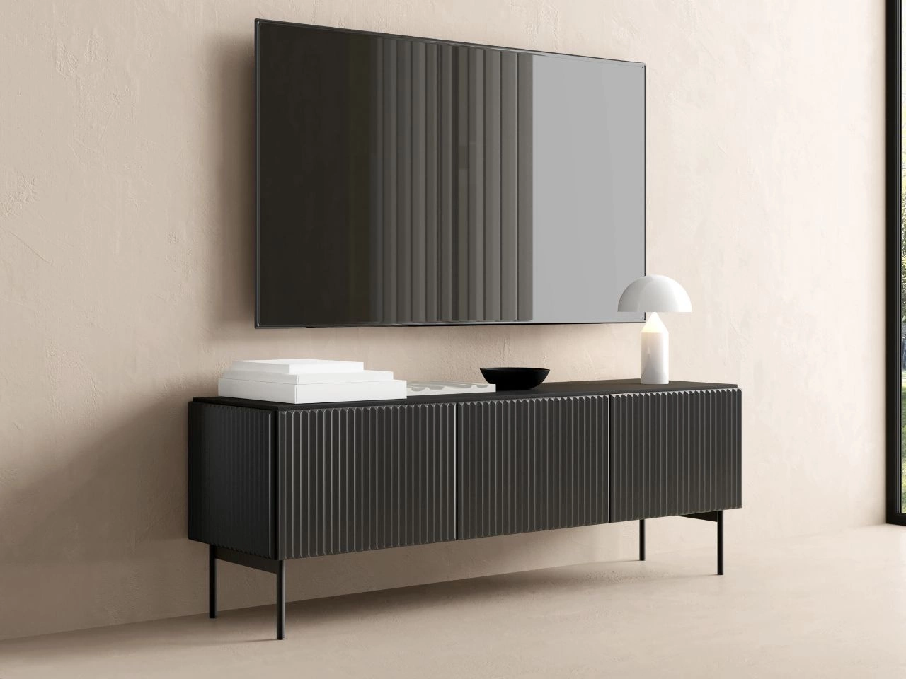 TV-Lowboard auf Metallfüßen verfügt über drei großzügige Fächer mit nach unten öffnenden Klappenfronten, die einen bequemen Zugriff auf Elektronik, Kabel oder Zubehör ermöglichen. Hochwertige Klappbeschläge sorgen für ein sanftes und stabiles Öffnen, während die vollflächigen, geriffelten Fronten den modernen Charakter unterstreichen und eine aufgeräumte, elegante TV-Zone schaffen. Der Innenbereich ist zusätzlich mit einer HDF-Platte verstärkt, was die hohe Verarbeitungsqualität betont und ein ästhetisches Finish garantiert.