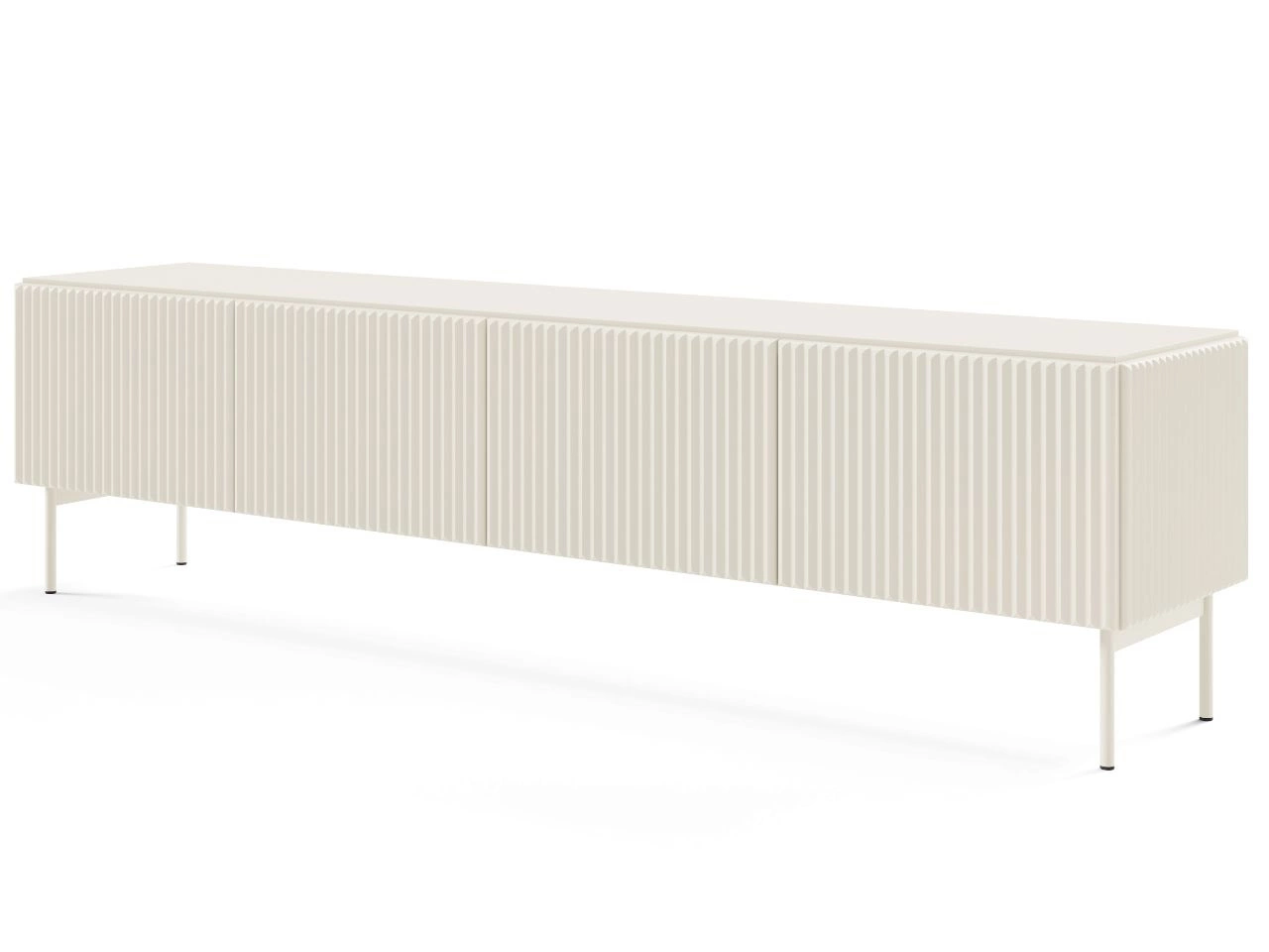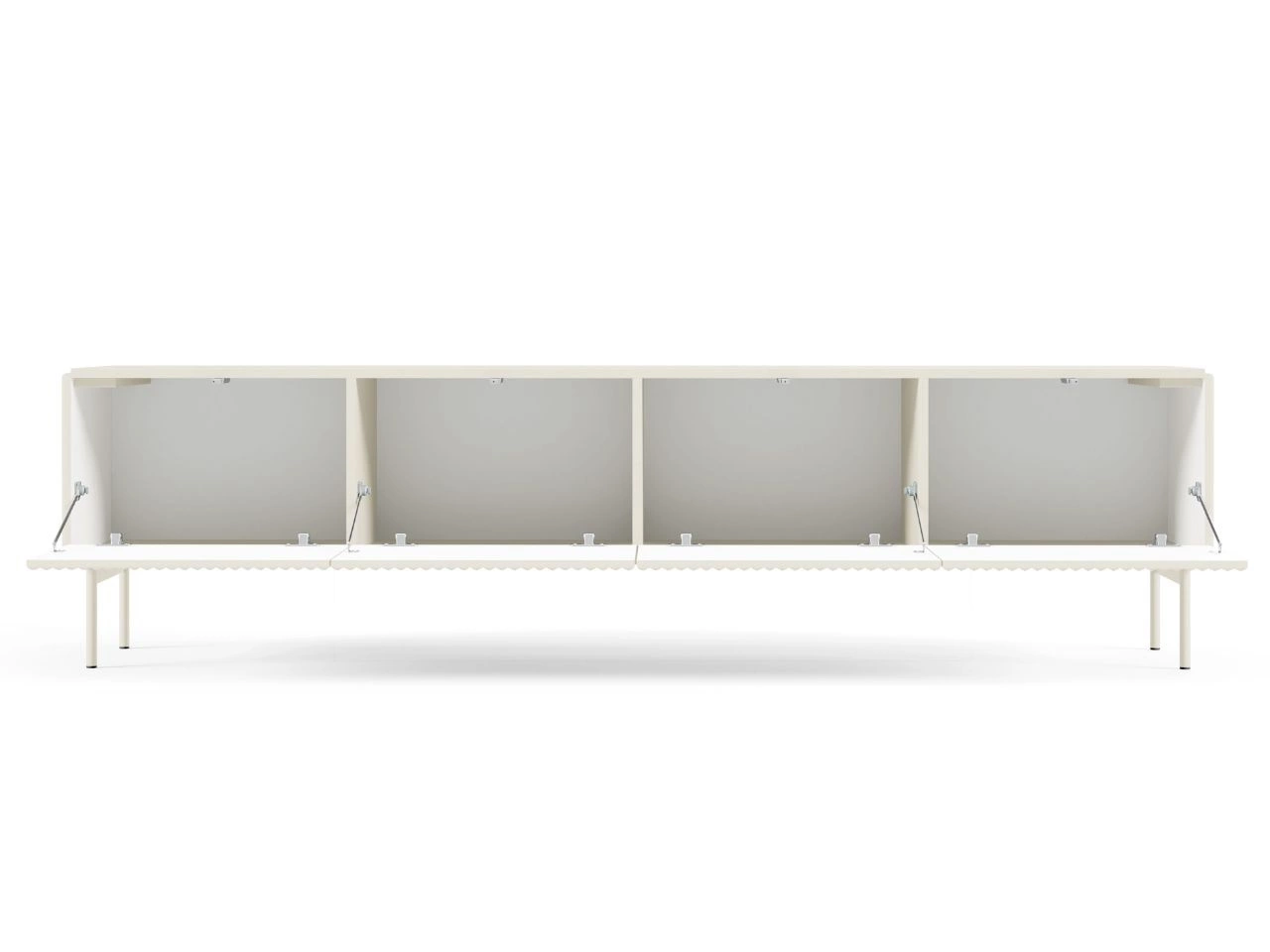Das TV-Lowboard auf Metallbeinen verfügt über vier geräumige Fächer, die mit nach unten öffnenden Klappenfronten ausgestattet sind. Diese erleichtern den Zugriff auf Elektronik, Kabel und Zubehör. Stabile Klappmechanismen sorgen für ein sanftes und kontrolliertes Öffnen, während die vollflächigen, geriffelten Fronten den modernen Charakter des Möbelstücks unterstreichen und für ein aufgeräumtes, harmonisches Erscheinungsbild im TV-Bereich sorgen. Das Innere wurde zusätzlich mit einer HDF-Platte verstärkt, was die Verarbeitungsqualität hervorhebt und ein sauberes Finish gewährleistet.