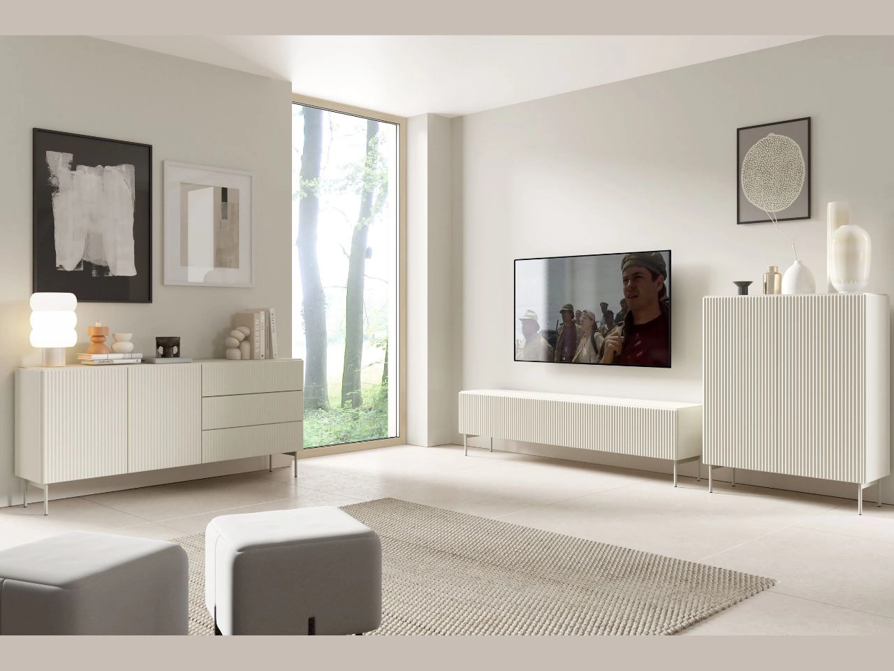 Das TV-Lowboard bietet Platz für Multimedia-Geräte und Zubehör und sorgt für Ordnung im Wohnbereich. Durchdachte Fächer und geriffelte Fronten verleihen ihm einen modernen, stilvollen Charakter.