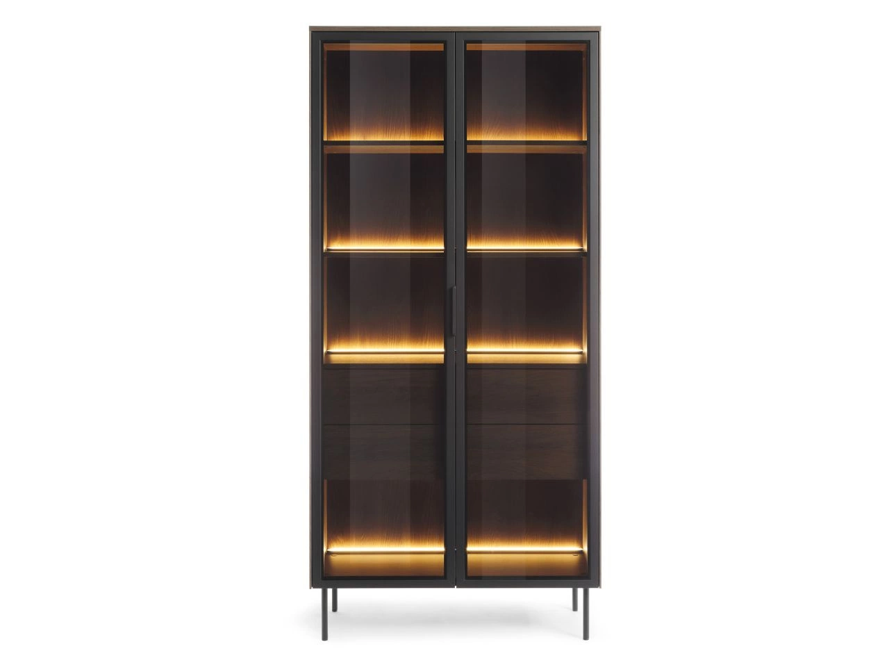Die Vitrine auf Metallfüßen fügt sich harmonisch in moderne, elegante und industrielle Einrichtungen ein – ideal für Menschen, die Wert auf Stil, Qualität und einen funktionalen Stauraum legen.