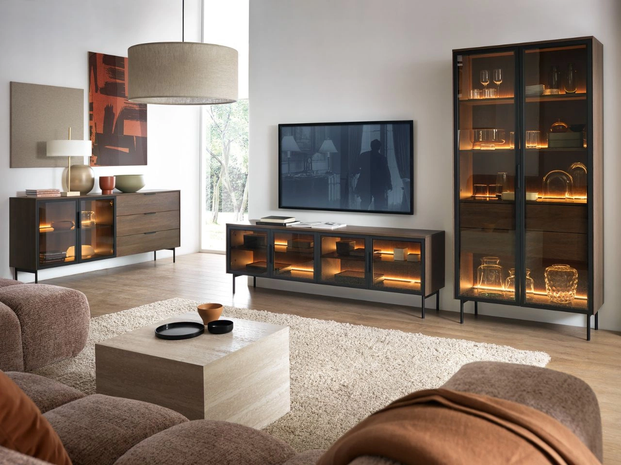 Abgerundet wird das Gesamtbild durch eine LED-Beleuchtung in warmweiß, die die Struktur der Oberflächen betont und sich perfekt zur Präsentation von Dekorationen, Glas oder Porzellan eignet. Das sanfte Licht schafft eine gemütliche Atmosphäre und macht die Vitrine mit Schubladen Lumina zu einem besonderen Blickfang im Wohn- oder Essbereich sowie im Arbeitszimmer.