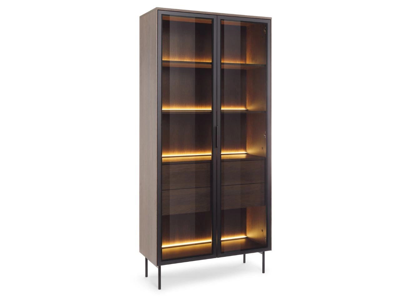 Die Möbel bestehen aus laminierter Spanplatte, ergänzt durch Elemente aus MDF sowie Rückwände aus HDF, was für Langlebigkeit und eine stabile Konstruktion sorgt. Das gesamte Set steht auf Metallfüßen, die den Möbelkorpussen Stabilität geben und ihren modernen Stil betonen. In den verglasten Bereichen wurde eine LED-Beleuchtung integriert, die eine angenehme Atmosphäre schafft und dekorative Elemente wirkungsvoll hervorhebt.