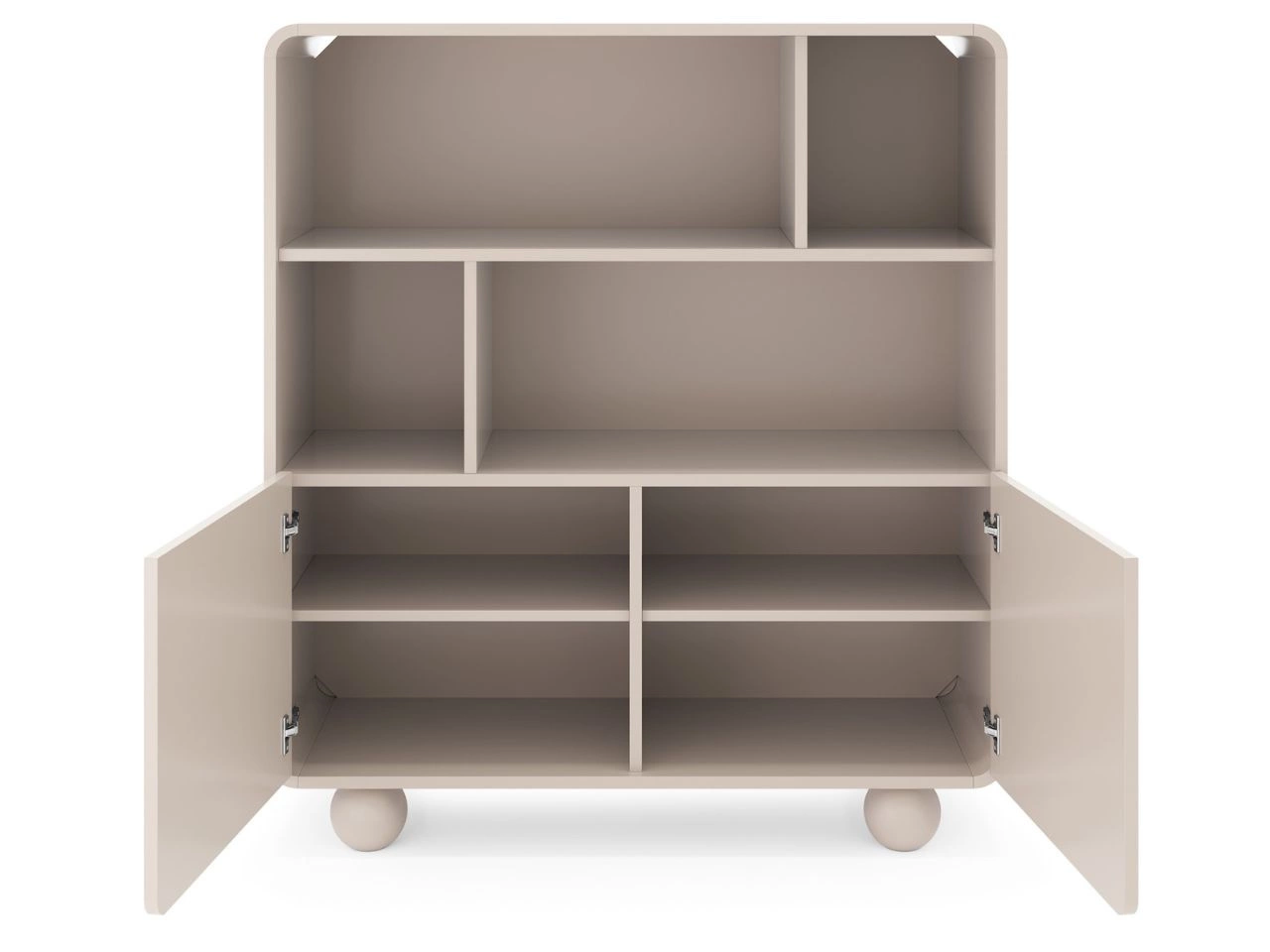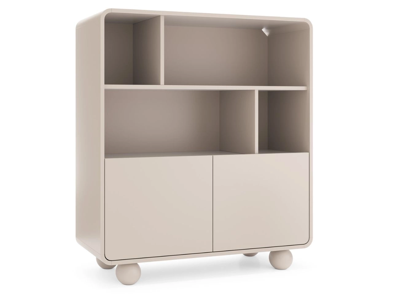 Der obere, offene Regalbereich bietet reichlich Platz für Bücher, Dekorationen, Pflanzen oder persönliche Accessoires, die bewusst in Szene gesetzt werden sollen. Ergänzt wird dies durch zwei geschlossene Fächer mit Push-to-Open-System – ein leichtes Antippen genügt, um die Türen leise und geschmeidig zu öffnen. So entsteht eine klare, geordnete Optik ohne sichtbare Griffe. Getragen wird das Regal mit Schränken von runden, geometrischen Füßen im Kaschmir-Farbton, die dem Design Leichtigkeit und moderne Raffinesse verleihen.
