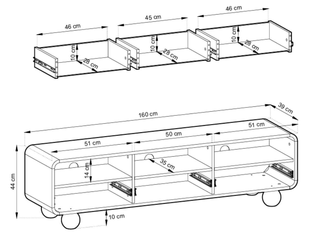 Der TV-Schrank verbindet Funktionalität und Design. Er verfügt über praktische Schubladen sowie offene Fächer mit Kabeldurchlässen und eignet sich ideal als Multimedia-Center, ohne dabei auf stilvolle Ästhetik zu verzichten.