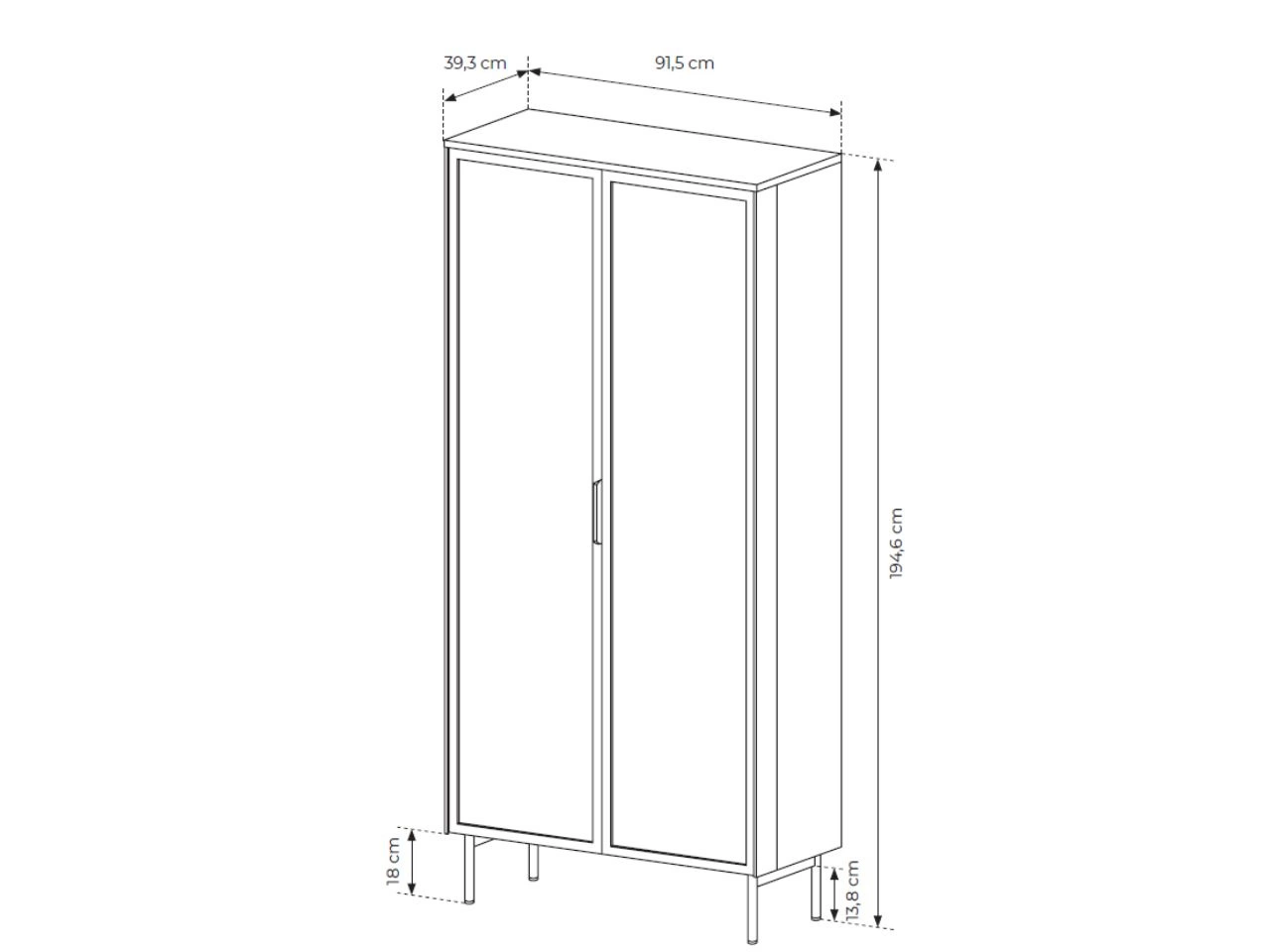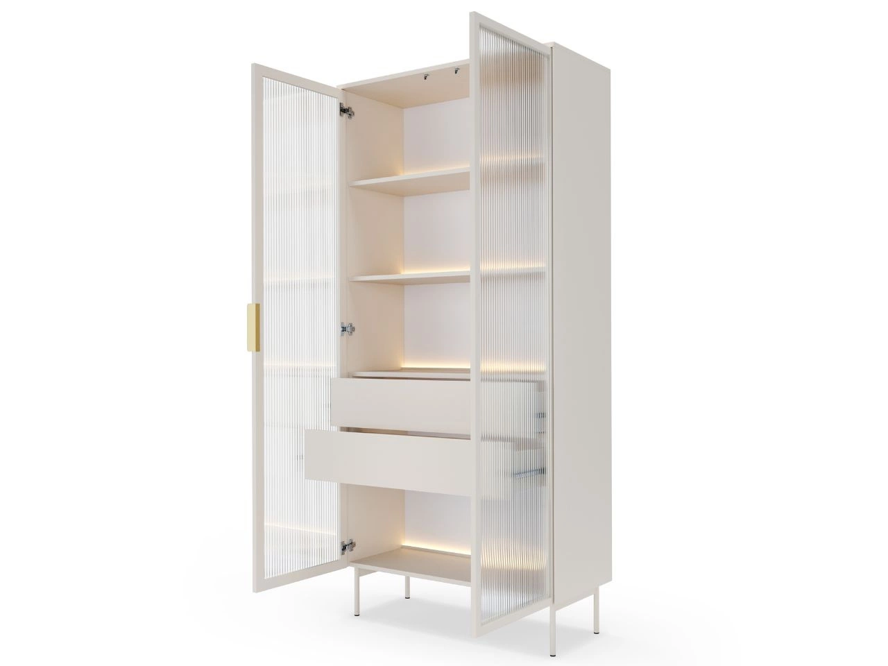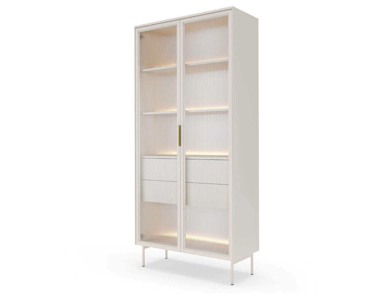 Die Möbel bestehen aus laminierter Spanplatte, ergänzt durch Elemente aus MDF sowie Rückwände aus HDF, was Stabilität, Widerstandsfähigkeit und eine lange Lebensdauer gewährleistet. Getragen wird das Ganze von schlanken Metallfüßen im Farbton Kaschmir, die das elegante, moderne Design der Kollektion unterstreichen. In Vitrinen und verglasten Schränken kommt eine LED-Beleuchtung zum Einsatz, die für eine stimmungsvolle Lichtwirkung sorgt und dekorative Elemente im Innenraum hervorhebt.