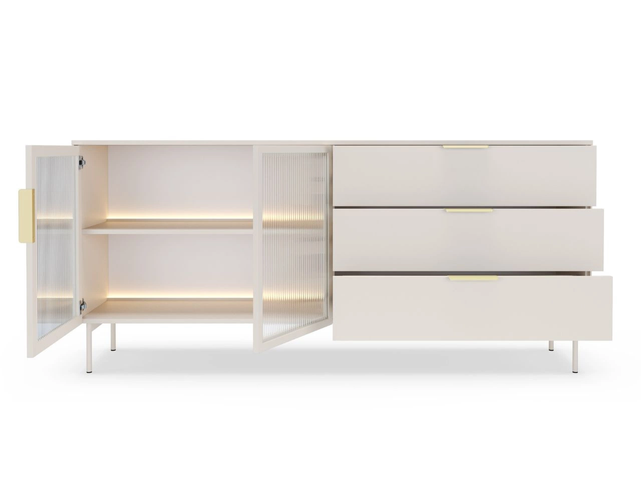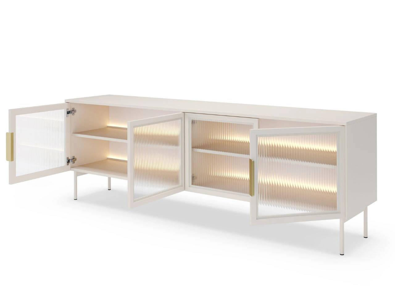- Die Möbel verfügen über Ornamentglas Flutes – gehärtetes Glas mit vertikaler Rillenstruktur, das das Licht sanft streut und dem Gesamtbild einen eleganten, modernen Look verleiht.