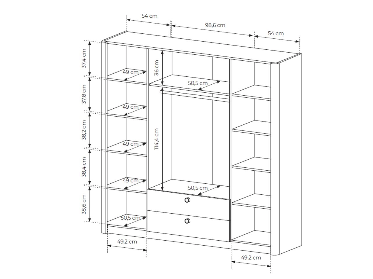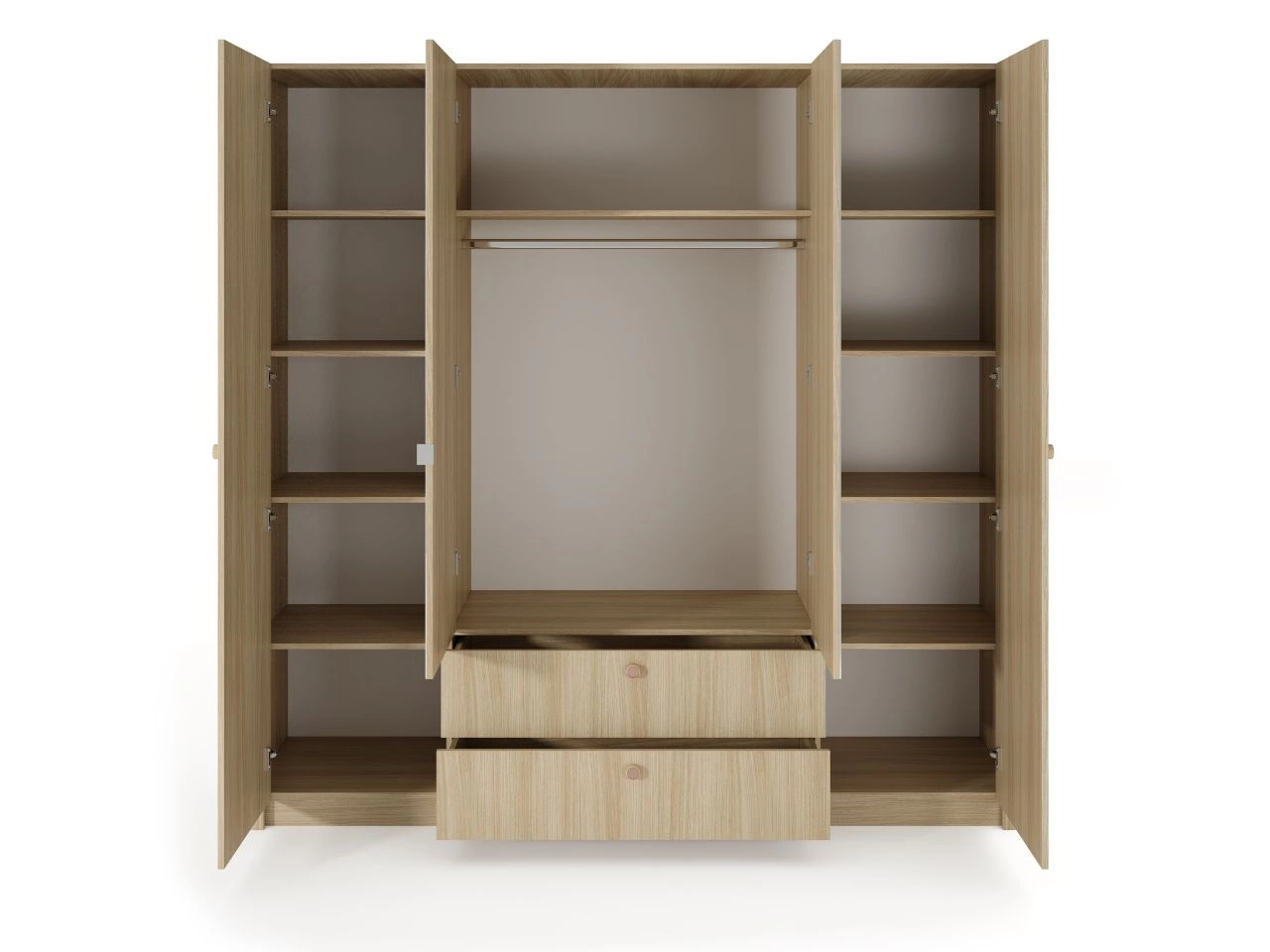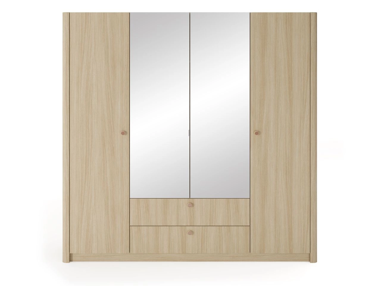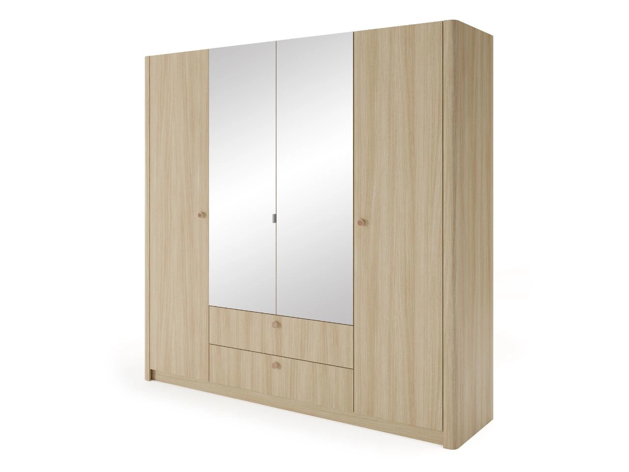 Der Kleiderschrank verbindet ein hohes Fassungsvermögen mit einer praktischen Einteilung aus Fachböden und Kleiderstangen, was die Aufbewahrung der Garderobe erleichtert. Die schlichte Form, Holzfüße und dezente Griffe betonen den modernen, leichten Charakter des Möbels.