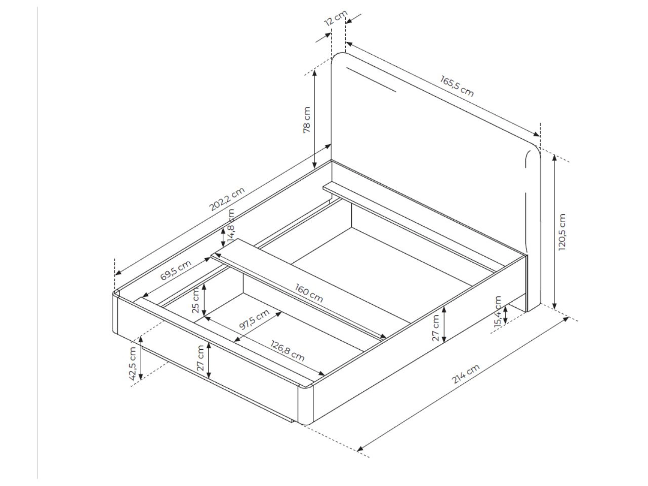 Das zentrale Element der Kollektion ist das Bett mit gepolstertem Kopfteil, das dem Raum Weichheit und Komfort verleiht. Das Möbel ist mit einem praktischen Bettkasten für Bettzeug ausgestattet, der zusätzlichen Stauraum bietet.