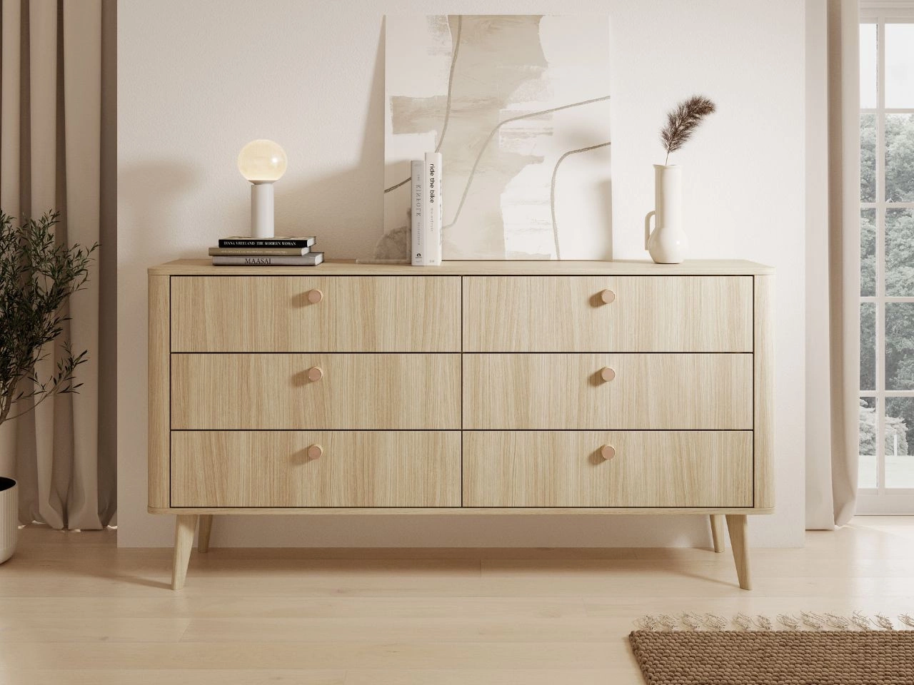 Die Kommode bietet großzügigen Stauraum für Kleidung, Heimtextilien und wichtige Alltagsutensilien. Die durchdachte Innenaufteilung erleichtert es, Ordnung und Übersicht im Schlafzimmer zu bewahren.