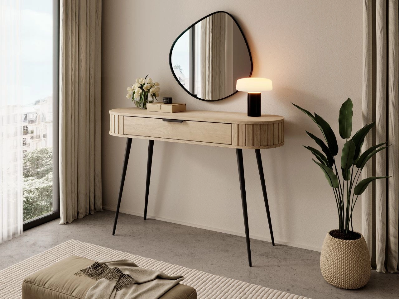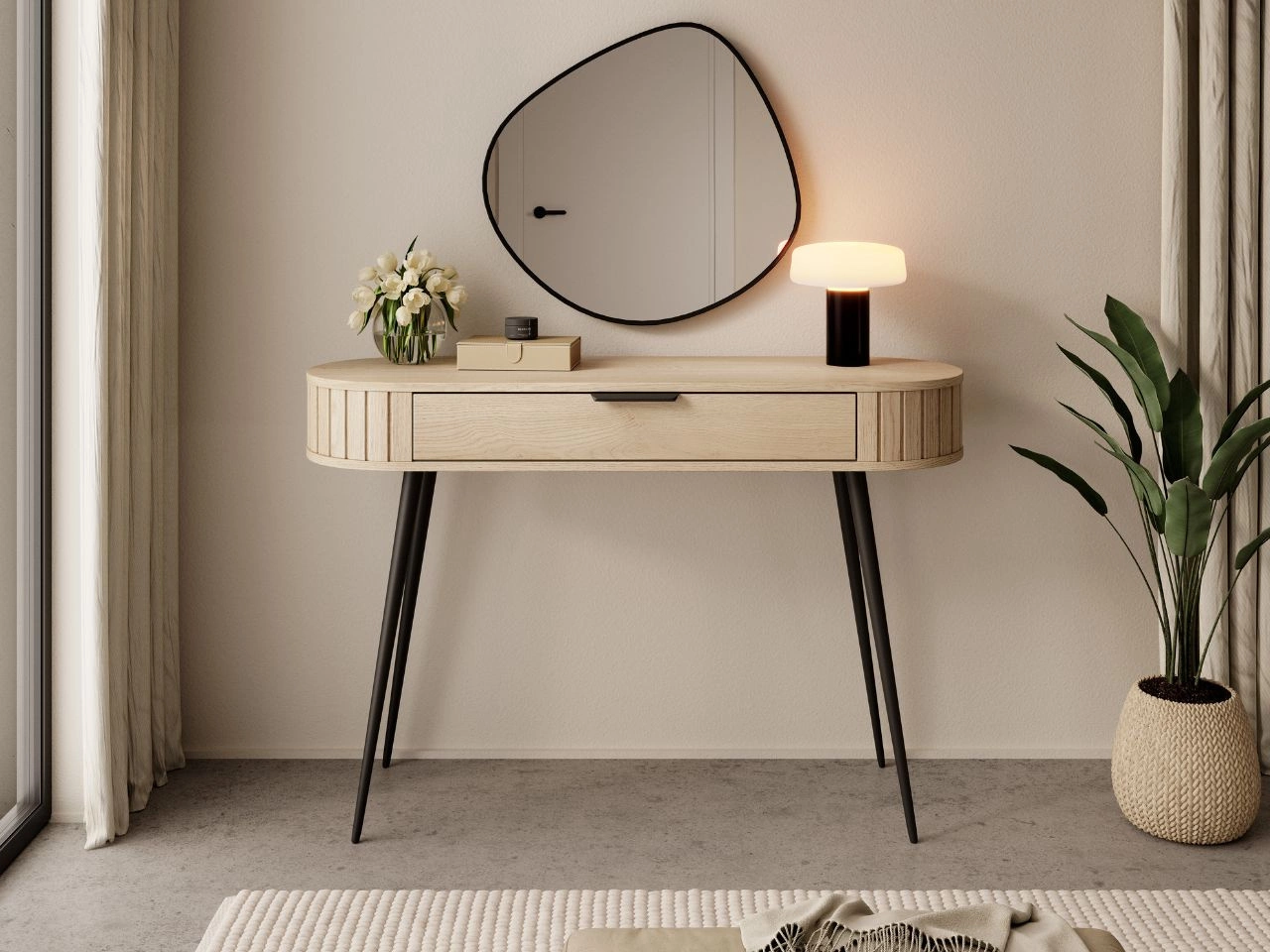 Der Kosmetiktisch Passione verfügt über eine geräumige Schublade, die ideal zur Aufbewahrung von Make-up, Accessoires und kleinen Alltagsgegenständen ist. Der Korpus aus laminiertem, geriffeltem Spanplattenmaterial harmoniert perfekt mit der glatten MDF-Front der Schublade und sorgt für eine moderne, ästhetische Optik. Die gefrästen und abgerundeten MDF-Leisten an den Seiten unterstreichen den eleganten Charakter des Möbels. Ein Metallgriff sowie die schwarzen Metallbeine verleihen dem Schminktisch eine zusätzliche, dezente Vintage-Note.