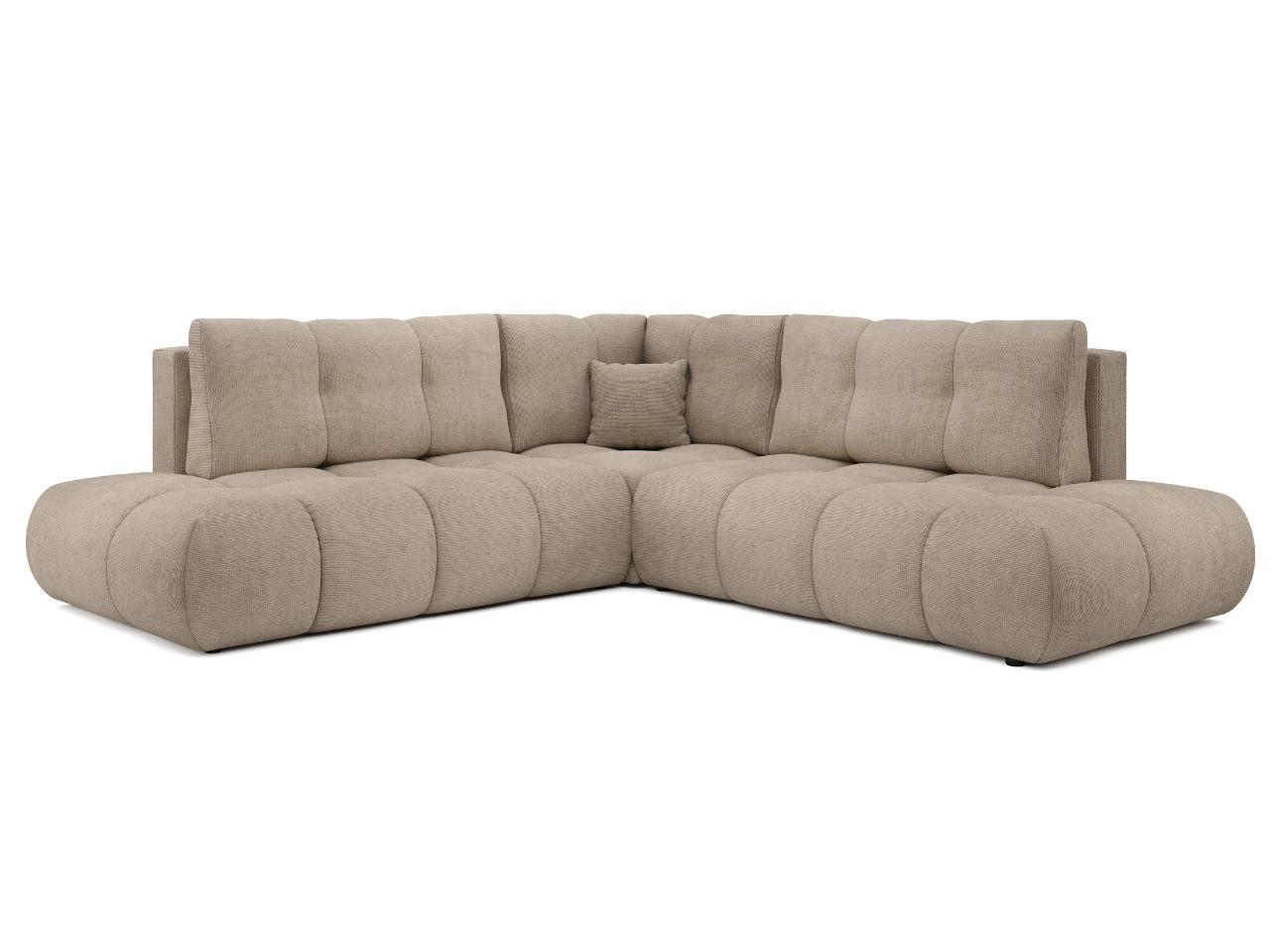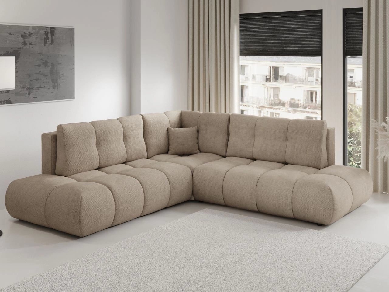 Ecksofa Kair ist ein modernes und äußerst komfortables Polsterecksofa, das für entspannte Momente im Alltag entwickelt wurde. Die weiche, abgerundete Form sowie die breiten, tiefen Sitzflächen schaffen eine besonders gemütliche Wohlfühlzone – ideal für das Wohnzimmer. Der Bezug aus einem Stoff mit deutlich sichtbarer, strukturierter Oberfläche verleiht dem Möbelstück einen eleganten und zeitlosen Charakter und passt hervorragend zu skandinavischen, modernen und minimalistischen Einrichtungen.