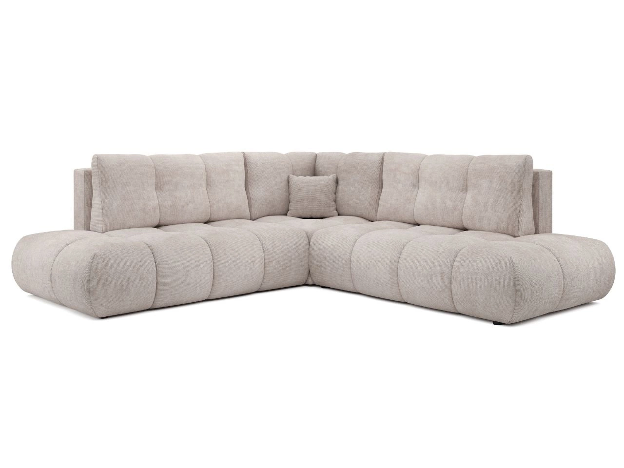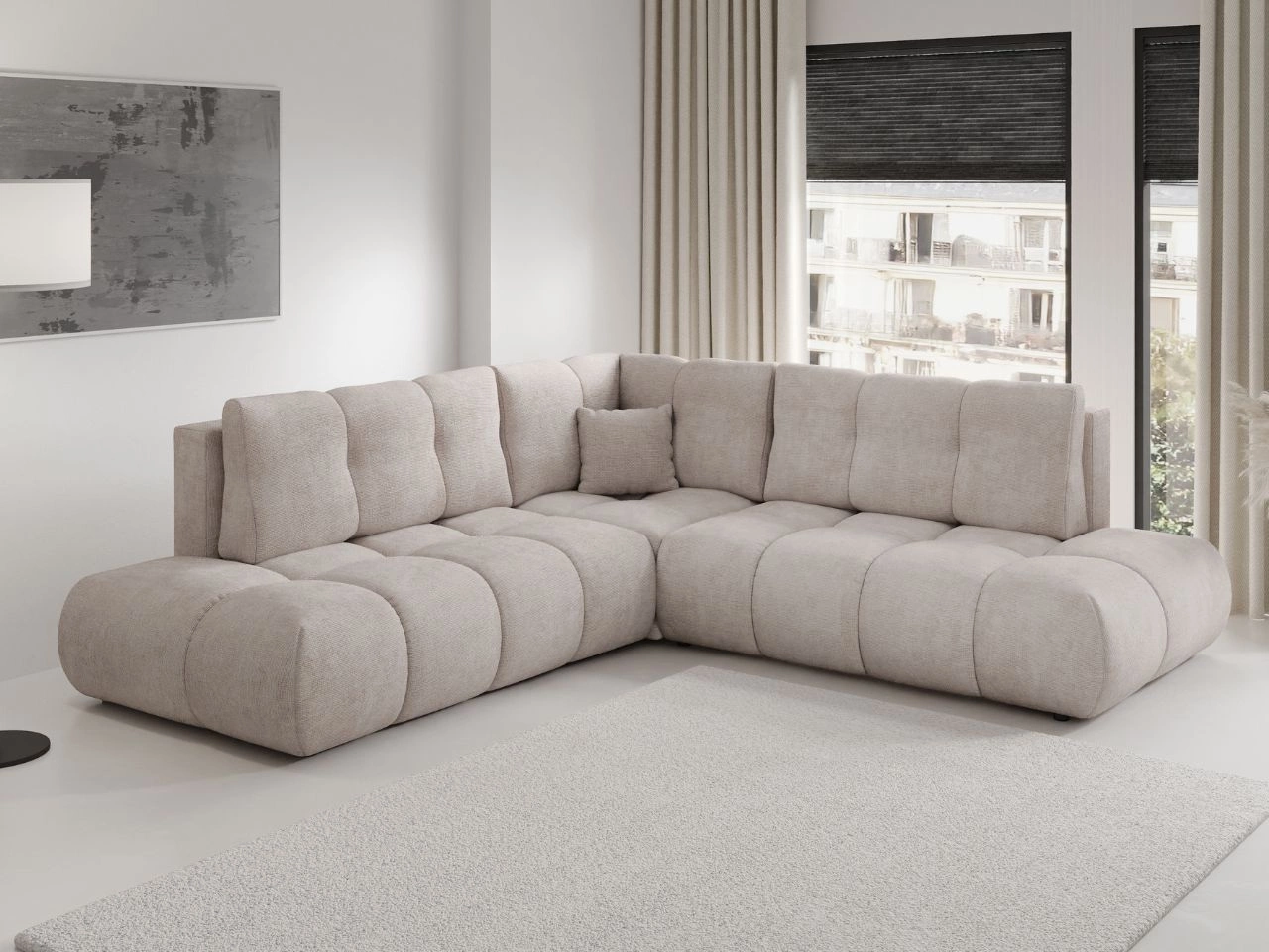 Ecksofa Kair ist ein modernes und äußerst komfortables Polsterecksofa, das für entspannte Momente im Alltag entwickelt wurde. Die weiche, abgerundete Form sowie die breiten, tiefen Sitzflächen schaffen eine besonders gemütliche Wohlfühlzone – ideal für das Wohnzimmer. Der Bezug aus einem Stoff mit deutlich sichtbarer, strukturierter Oberfläche verleiht dem Möbelstück einen eleganten und zeitlosen Charakter und passt hervorragend zu skandinavischen, modernen und minimalistischen Einrichtungen.