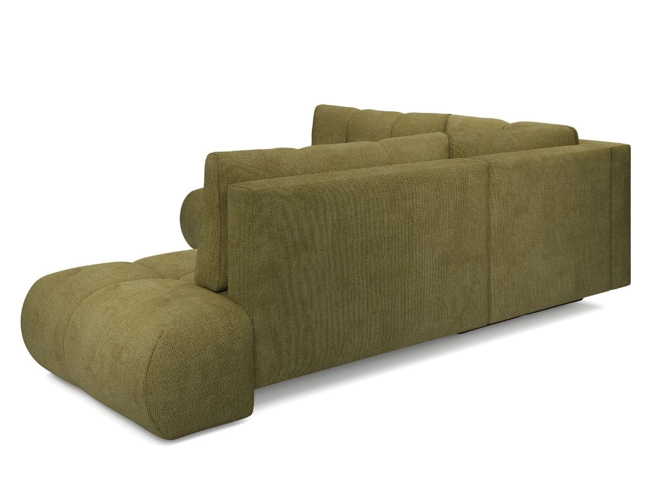Die Rückseite des Sofas ist vollständig bezogen, sodass das Ecksofa Kair nicht nur an der Wand, sondern auch frei im Raum platziert werden kann – ein stilvoller Blickfang in jedem Wohnraum. Die niedrige, stabile Basis unterstreicht die moderne Linienführung und verleiht dem Möbelstück trotz seiner massiven Form eine leichte, elegante Optik.