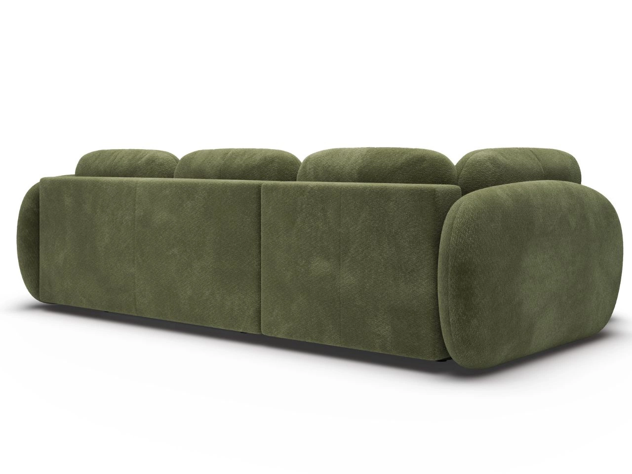 Das Ecksofa verfügt über eine vollständig bezogene Rückseite, sodass es nicht nur an der Wand, sondern auch frei im Raum stehen kann – ideal als stilvolles, freistehendes Wohnzimmerelement. Die stabile, niedrige Basis unterstreicht die moderne Form und verleiht der großzügigen Silhouette dennoch Leichtigkeit.