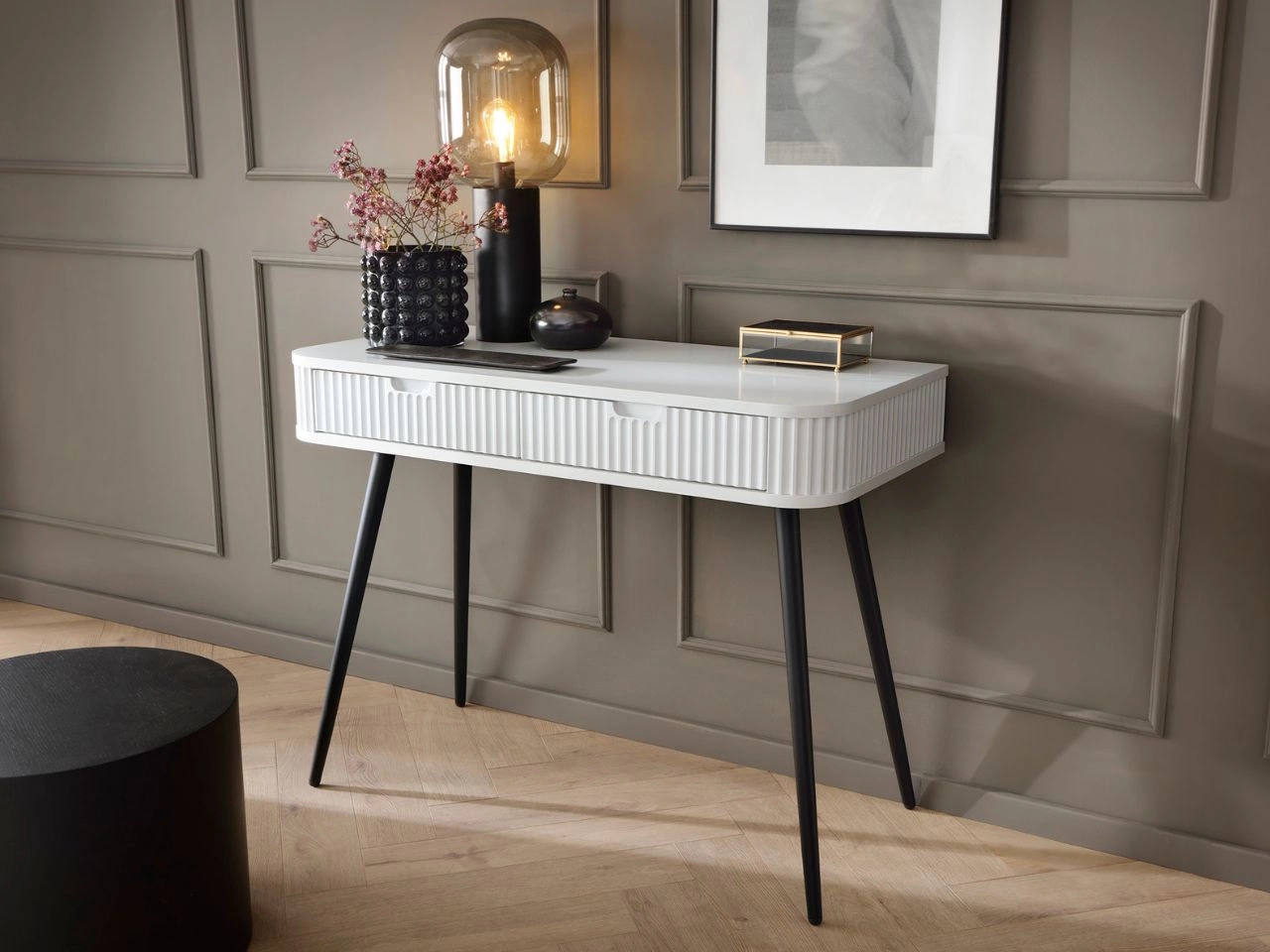 Schminktisch ist mit zwei geräumigen Schubladen ausgestattet, die sich auf zuverlässigen Rollenführungen bewegen und so eine reibungslose und leise Nutzung gewährleisten. Gerändelte Griffe und dezente Aussparungen erleichtern den Zugang zum Innenraum und schlanke schwarze Beine unterstreichen das schlichte, minimalistische Design. Der Viva Schminktisch ist die perfekte Wahl für alle, die Wert auf eine Kombination aus Stil und Funktionalität legen.