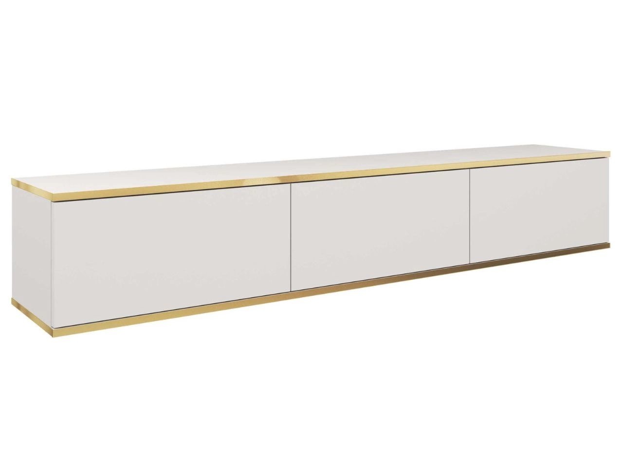 Hänge Lowboard-TV Diolo ist ein modernes Möbelstück, das sich durch seine Eleganz und Funktionalität auszeichnet. Er ist aus hochwertiger weiß Schichtstoffplatte gefertigt und hat goldene Kanten, die ihm einen einzigartigen Charakter verleihen. Dieses wandmontierte RTV-Möbel ist ideal für Innenräume im Glamour-Stil.