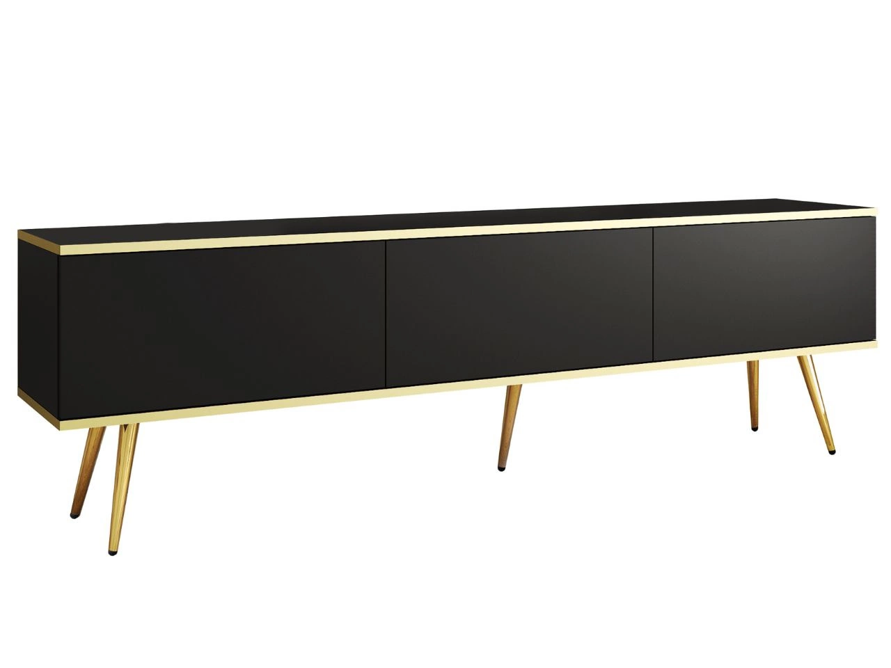 Das Lowboard verfügt über drei geräumige, geschlossene Fächer, die ideal zur Aufbewahrung von Kabeln und TV-Zubehör geeignet sind. Die breite Ablage bietet Platz für einen Receiver oder eine Spielekonsole und sorgt gleichzeitig für eine gute Belüftung der Geräte. Die gesamte Konstruktion steht auf eleganten goldfarbenen Beinen, die dem Möbelstück eine leichte und moderne Optik verleihen.