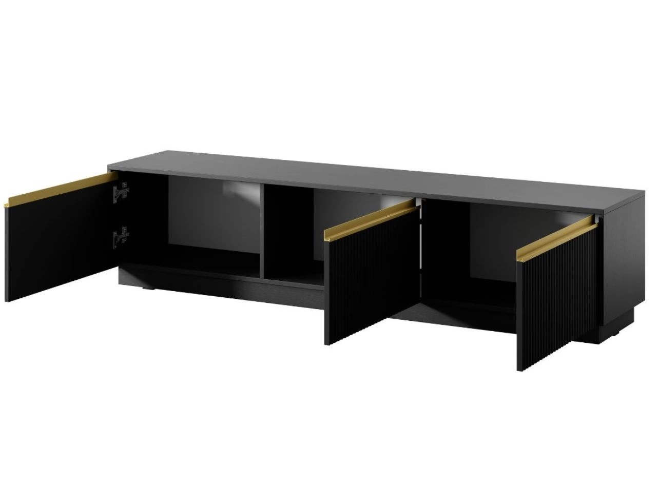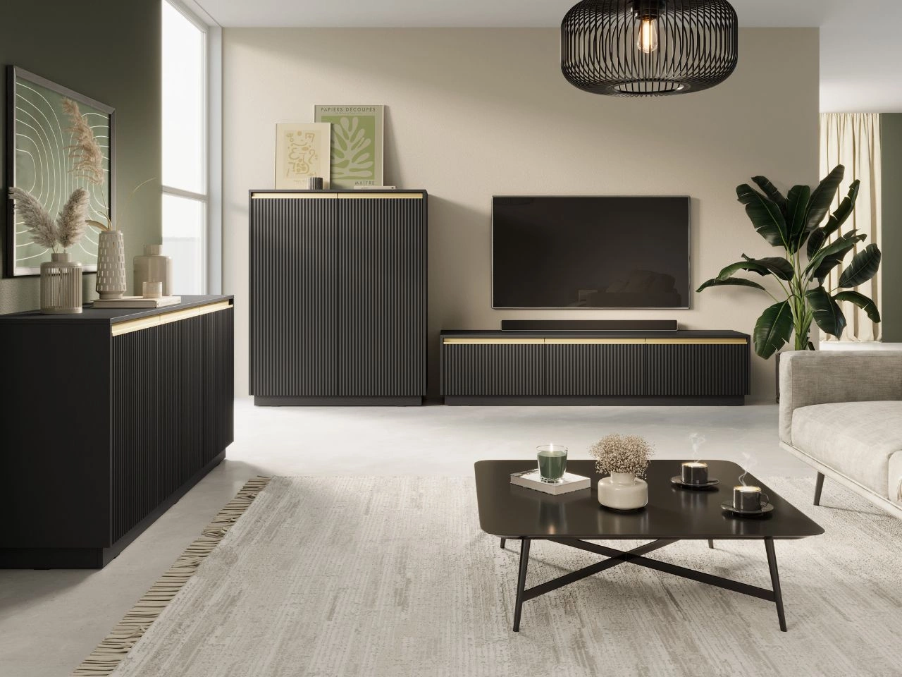 TV-Möbel aus der Roland-Kollektion ist ein elegantes und funktionales Element für moderne Innenräume. Sein Design zeichnet sich durch geriffelte Fronten aus, die dem Möbelstück einen einzigartigen, dreidimensionalen Charakter verleihen. Subtile Details wie die in Gold pulverbeschichteten Griffmulden verleihen dem Ganzen einen Hauch von Raffinesse und unterstreichen zugleich das minimalistische Erscheinungsbild.