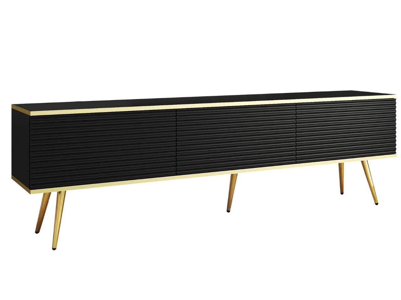 TV-Lowboard mit Türen 175 cm Diolo Schwarz mit geriffelter Vorderseite auf goldenen Beinen
