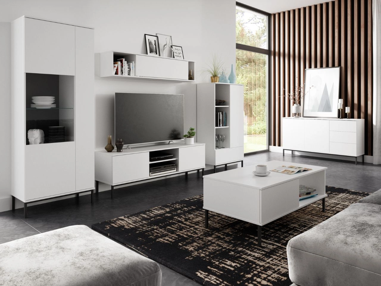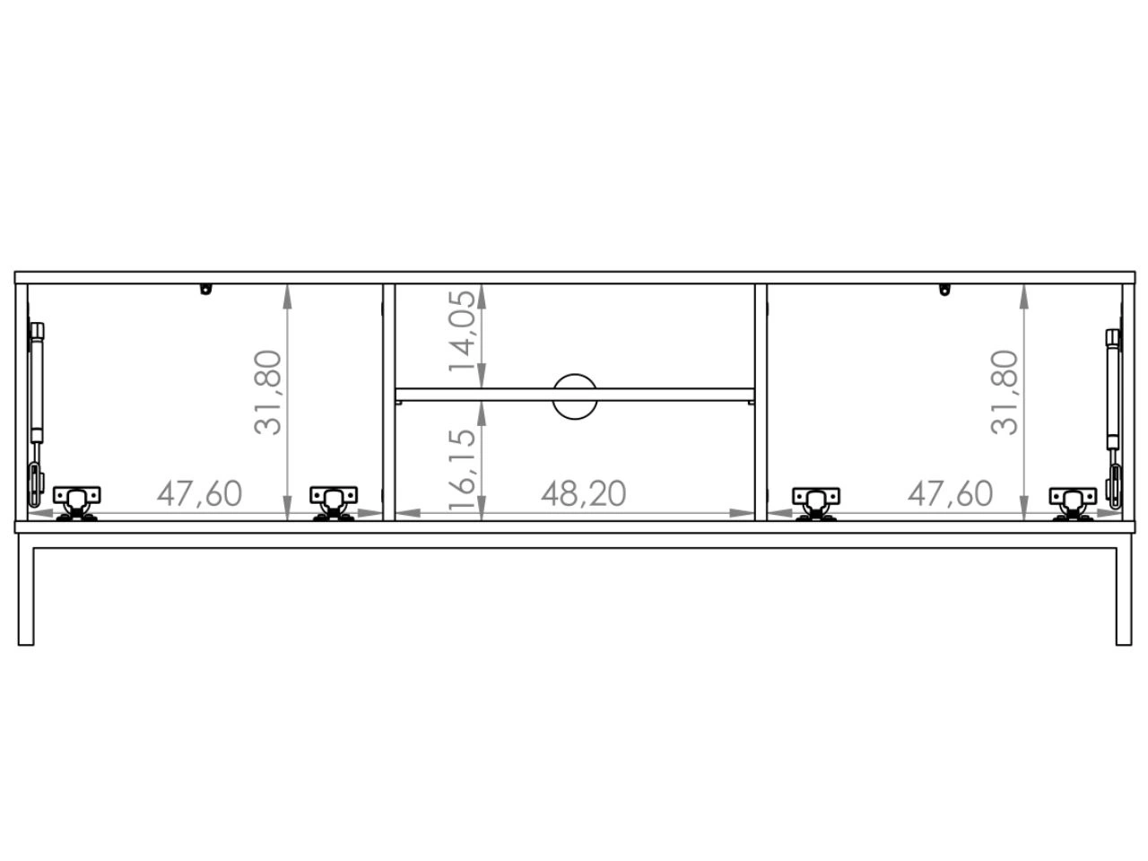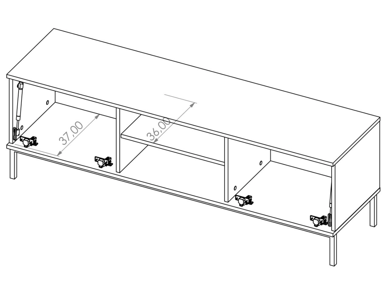 TV-Lowboard Soroko ist mit zwei offenen Fächern ausgestattet, auf denen Sie zum Beispiel eine Set-Top-Box unterbringen können. Außerdem gibt es eine Frontöffnung mit Push-to-Open-System, wo ein geräumiges Regal für die Aufbewahrung von kleinen Dekorationen oder Büchern zur Verfügung steht.
